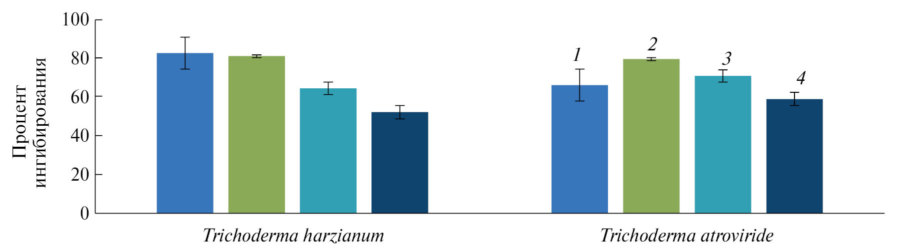 Рис. 2. Ингибирование радиального роста фитопатогена через 7 сут культивирования, %; (M ± ς). 1 — Fusarium (orthoceras) oxysporum; 2 — Alternaria botrytis; 3 — Stemphylium botryosum; 4 — Phytophthora drechsleri.