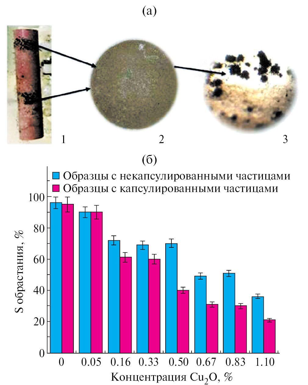 Рис. 1. Влияние некапсулированных и капсулированных частиц Cu2O на рост микромицетов на поверхности образцов полимерных композитов: а — A. niger, выделенный с поверхности композита с некапсулированными частицами в концентрации 1.10% (1 — рост на поверхности композита; 2 — рост на поверхности агаризованной среды Чапека–Докса; 3 — микроскопия, × 64); б — площадь обрастания поверхности на 28 сут инкубирования.