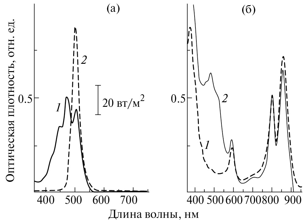 Рис. 1. а ‒ Cпектр поглощения родопина, используемого для встраивания (1) и спектр излучения светодиода; б ‒ cпектры поглощения ДФА-мембран из клеток Alc. vinosum с ингибированным синтезом Кар до (1) и после добавления к ним 3 порций родопина и последующего диализа (2)