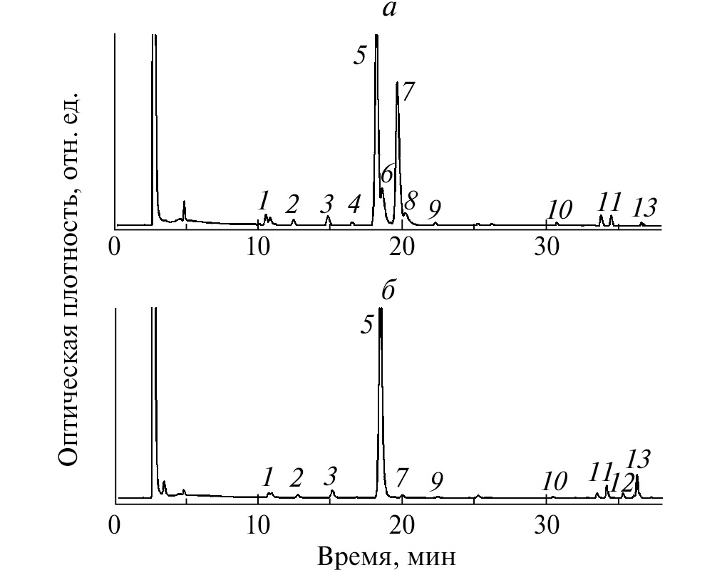 Рис. 3. ВЭЖХ пигментов комплекса LH2 со встроенным родопином (а) и ДФА-комплекса LH2 (б) из Alc. vinosum. Идентификация пиков: 1‒5 ‒ БХл и его производные; 6 – дидегидрородопин; 7 – родопин; 8 – спирилоксантин; 9 ‒ бактериофеофитин; 10 – неидентифицированный продукт некаротиноидной природы; 11 – ζ-каротин; 12 – фитофлуин; 13 – фитоин
