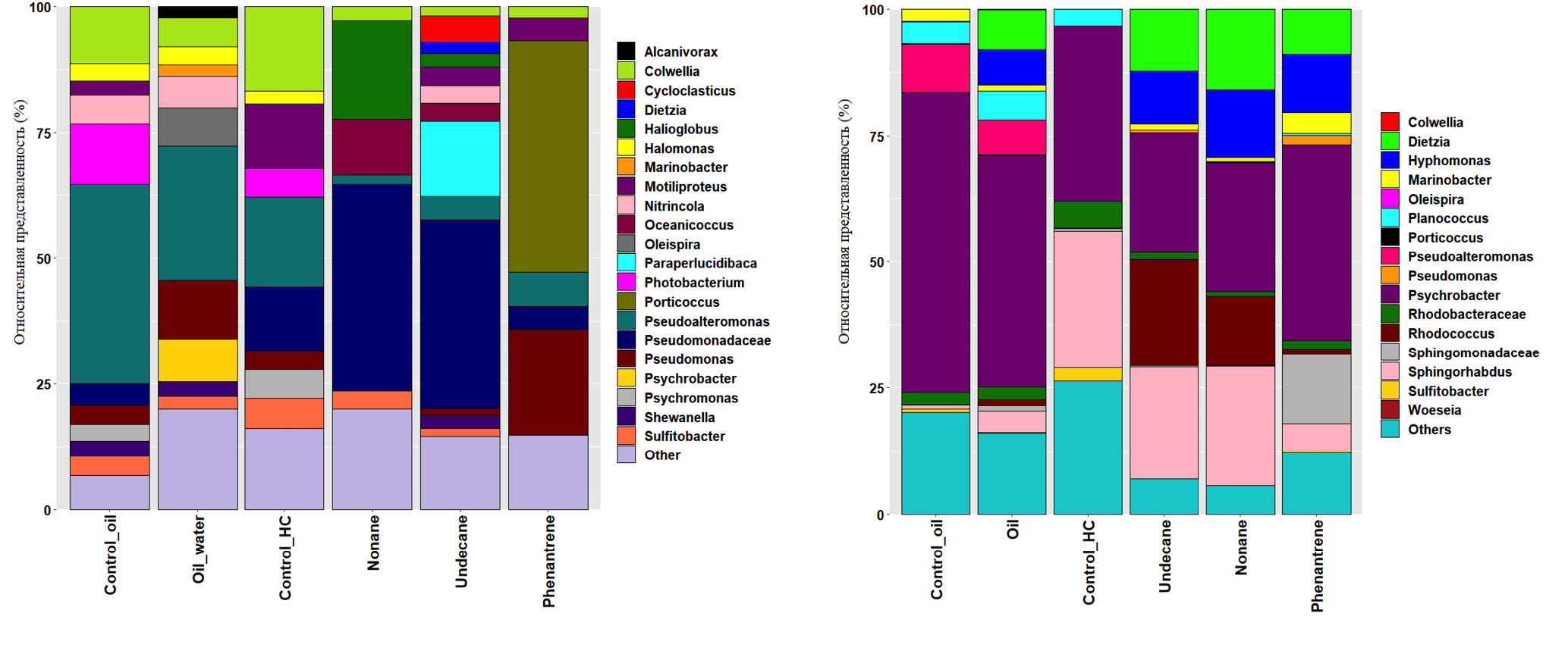 Также были проанализированы 22 микрокосма, культивируемых без внесения углеводородного субстрата. При культивировании придонной воды Баренцева моря в присутствии сырой нефти (рис. 1а, Oil) наблюдается увеличение, по сравнению с контролем (рис. 1а, Control_oil), относительного содержания бактерий родов Pseudoalteromonas с 5.4 до 33.16%, Pseudomonas с 0.48 до 15.57%, Oleispira с 0.94 до 10.04%. Добавление н-алканов привело к увеличению содержания неидентифицированных членов семейства Pseudomonadaceae с 8.1 до 41.14% в случае н-нонана (рис. 1а, Nonane) и до 37.63% (рис. 1а, Undecane). Использование фенантрена также стимулировало изменение состава микробного сообщества: было отмечено увеличение содержание бактерий родов Porticoccus с 0.32 до 46.01% и Pseudomonas с 5.02 до 21.09% (рис. 1а, Phenantrene).