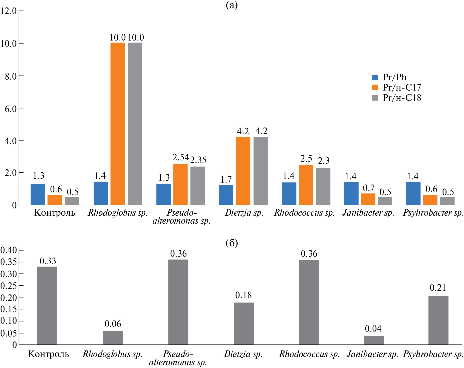 Из полученных микрокосмов были выделены чистые культуры представителей родов Pseudoalteromonas, Janibacter, Rhodoglobus, Rhodococcus, Psyhrobacter, для которых была изучена способность к утилизации углеводородов нефти. Для оценки утилизации линейных алканов использовались соотношения пристана (Pr) к н-гептадекану (н-С17) и фитана (Ph) к н-октадекану (н-С18). Пристан и фитан слабо подвержены процессам биологического окисления, в то время как исчезновение н-С17 и н-С18 в нефтях является первым признаком биодеградации (Гордадзе и соавт., 2015). Значения соотношений Pr/н-C17 и Ph/н-C18 в контроле (без внесения культуры бактерий) составляли 0.6 и 0.5. Соотношение пристана к фитану Pr/Ph, которое должно оставаться постоянным для исходной и подверженной микробному окислению нефти, как в контроле, так и в опытных образцах, составило 1.3‒1.4. Установлено, что наиболее активно разлагали н-алканы бактерии родов Rhodoglobus (Pr/н-C17 = 10 и Ph/н-C18 = 10), Dietzia (4.2 и 4.2), Rhodococcus (2.3 и 2.7), Pseudoalteromonas (2.5 и 2.3); с меньшей интенсивностью – Psychrobacter (0.6 и 0.5) и Janibacter (0.7 и 0.5) (рис. 2а).