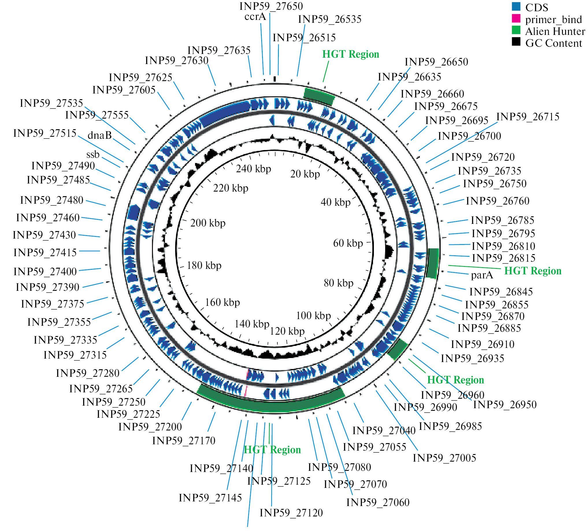 Рис. 1. Генетическая карта плазмиды Psid. INP – обозначение белок-кодирующих последовательностей, HGT Region – участок, который, предположительно, был привнесен в результате горизонтального переноса.