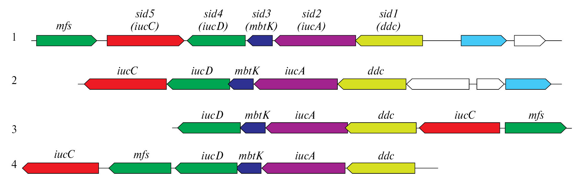 Рис. 2. Организация кластера биосинтеза сидерофоров у различных бактерий: 1 – плазмида pSID R. pyridinivorans 5Ар; 2 – Paenactinomyces guangxiensis s-10 (NZ_JACEIQ000000000.1); 3 – Streptomyces ficellus NRRL 8067 (CP034279.1); 4 – Myxococcus hansupus mixupus (CP012109.1).