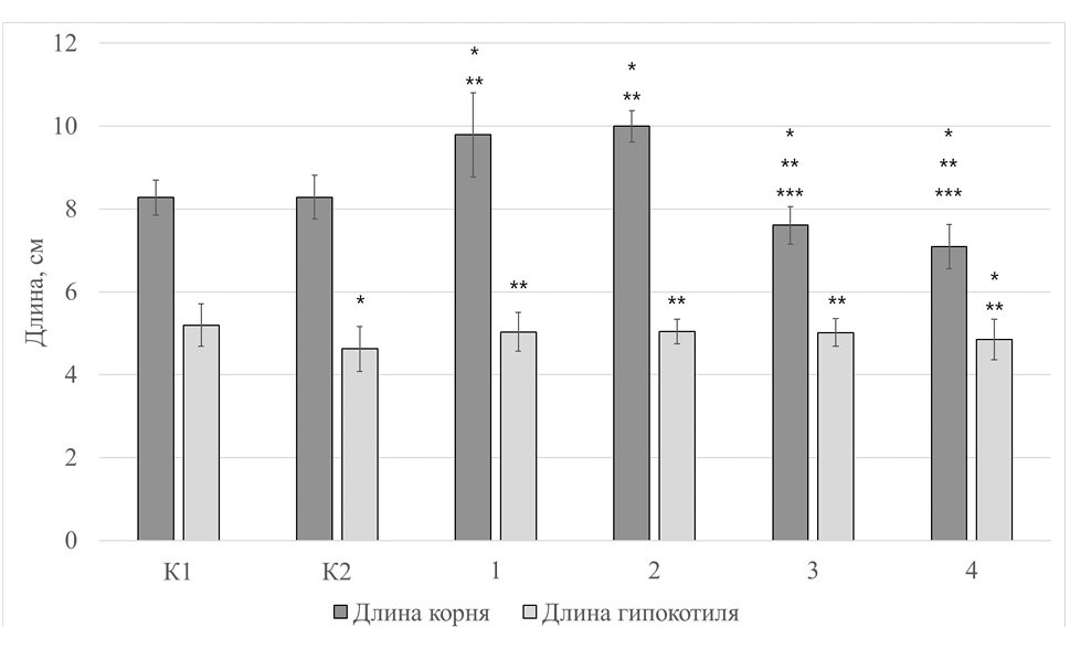 Рис. 3. Влияние бактерий рода Rhodococcus на морфометрические показатели проростков редиса красного. К1 – вода; К2 – среда Мейнелла; 1 – 24-часовая культура бактерий R. pyridinivorans 5Ар; 2 – 48-часовая культура бактерий R. pyridinivorans 5Ар; 3 – 24-часовая культура бактерий R. pyridinivorans 5Ар RifR sid::pK18mob; 4 – 48-часовая культура бактерий R. pyridinivorans 5Ар RifR sid::pK18mob. * ‒ Отличия от К1 достоверны при р ≤ 0.05; ** ‒ отличия от К2 достоверны при р ≤ 0.05; *** ‒ отличия от дикого типа достоверны при р ≤ 0.05. Высота столбцов отражает среднее значение, планки погрешностей – среднеквадратичное отклонение.