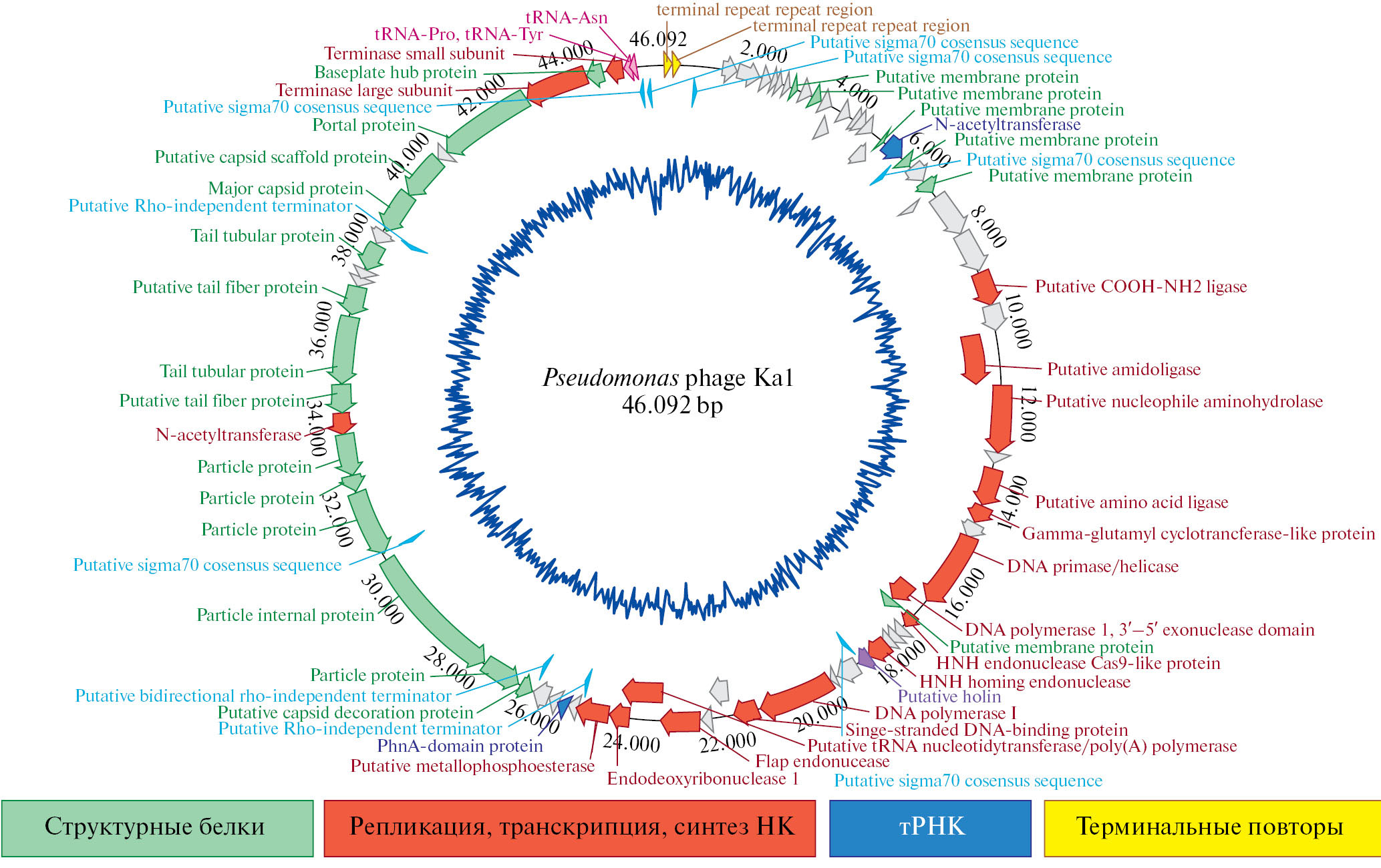 Характеристика бактериофага Pseudomonas phage Ка1. Из притока озера Байкал в зоне сброса сточных вод вблизи г. Слюдянка был выделен изолят Ка1, способный лизировать клетки P. aeruginosa ATCC 27853. ДНК изолята была выделена с помощью коммерческого набора Viral RNA/DNA Mini Kit (“Invitrogen”) и проведено shortgun-секвенирование с двуконцевыми прочтениями на платформе Illumina MySeq. После удаления прочтений, относящихся к геному P. aeruginosa ATCC 27853, выход секвенирования составил 14.952 Мб. На основе оставшихся прочтений был собран кольцевой геном размером 46092 п.о. с уровнем ошибки 0.0028 и покрытием 316×, с 50%-ым содержанием Г + Ц пар. Сравнение генома с помощью алгоритма BLAST с базой данных GenBank выявило максимальную идентичность в 95.14% при покрытии 79% с геномом Pseudomonas phage PSA37 (AN MZ089740.1) рода Bruynoghevirus из класса Caudoviricetes. Выравнивание геномов бактериофагов Ка1 и PSA37 алгоритмом ClustalO показало 91% идентичности геномов, что позволяет утверждать, что выделен новый представитель Luz24-подобных фагов (Bruynoghevirus).