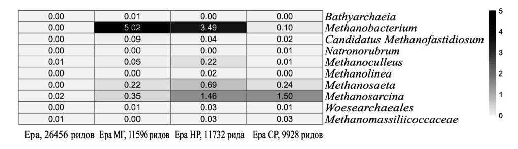 В архейном компоненте сообщества в возрастании доли метаногенов до 2-6% ключевую роль сыграли представители родов Methanobacterium и Methanosarcina (рис. 9).