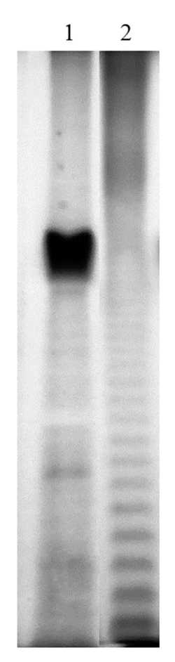 Рис. 1. Электрофореграмма препаратов липополисахаридов в 13.5% ПААГ в присутствии додецилсульфата натрия: A. agricola CC-HIH038T (1), Pseudomonas putida TSh-18 B2 (2).