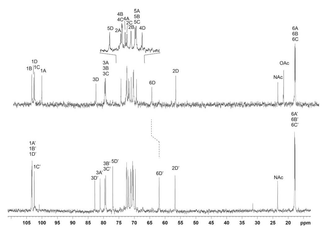 → 3)- b- d-Glc p NAc6Ac-(1 → D | 4.76 102.7 | 3.86 56.6 | 3.62 82.5 | 3.61 69.3 | 3.65 74.4 | 4.27, 4.34 64.4 | 2.16 21.5 | 175.3 |