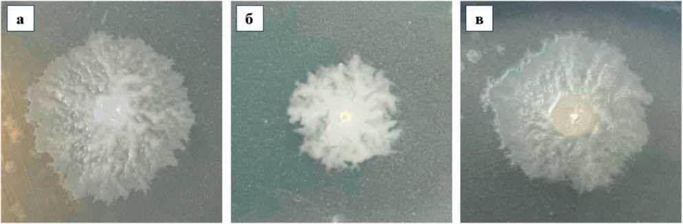 Рис. 1. Сравнительная морфологическая оценка 6-сут бактериальных колоний Bt subsp. israelensis, выделенных из среднего отдела кишечника личинок Aedes flavescens; а ‒ 4369; б ‒ 4929; в ‒ 4999.