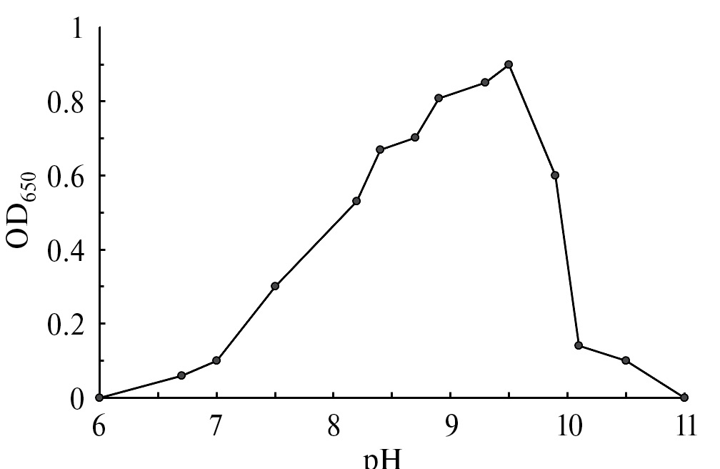 Бактерии всех штаммов были алкалофилами с оптимумом роста при рН 9–9.5 (диапазон рН 7.5–10.2) (рис. 3).