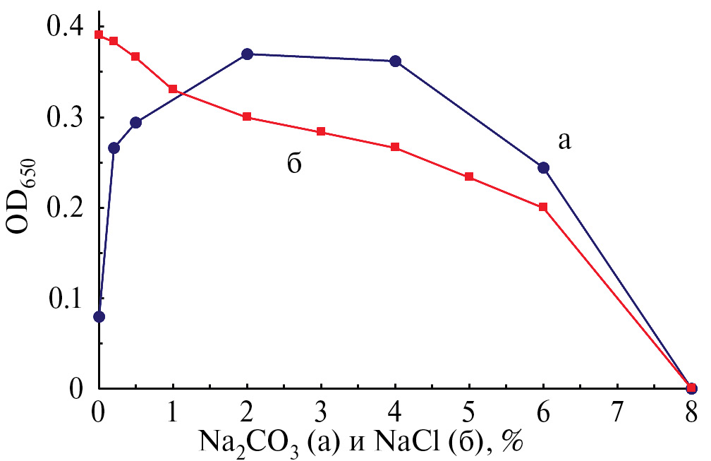 Рис. 4. Влияние Na₂CO₃ и NaCl на рост бактерий Trs. sibirica BG35.