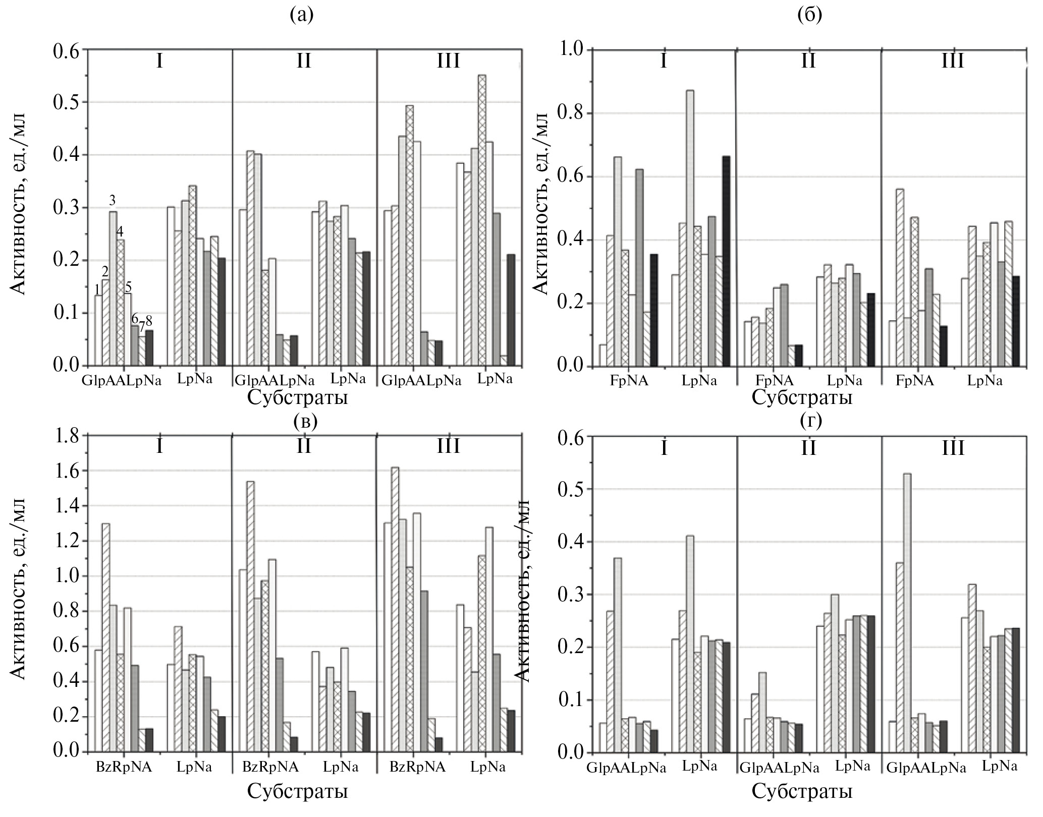 Изучение спектра пептидаз, секретируемых различными штаммами, выявило, что штаммы бактерий Н–Н1 и Н–Н4 активно продуцировали пептидазы, гидролизующие синтетические субстраты, специфичные для субтилизинподобных пептидаз GlpAALpNa и аминопептидаз – LpNA (рис. 2а, 2г). Следует отметить, что штамм Н–Н1 показал наиболее высокую активность на 7 сут культивирования. Наибольшая активность в отношении субстрата, специфичного для субтилизинподобных пептидаз и аминопептидаз (LpNa) у штамма Н–Н1 обнаружена при минерализации 10 г/дм3 и достигала 0.49 и 0.55 ед./мл соответственно. Штамм Н–Н4 был наиболее активен на 3 и 7 сут культивирования при повышенных значениях рН. Максимальные активности для аминопептидаз обнаружены на 3 сут (LpNa) при рН 10.0 (0.41 ед./мл), для субтилизинподобных пептидаз на 7 сут при рН 10.0 (0.53 ед./мл).
