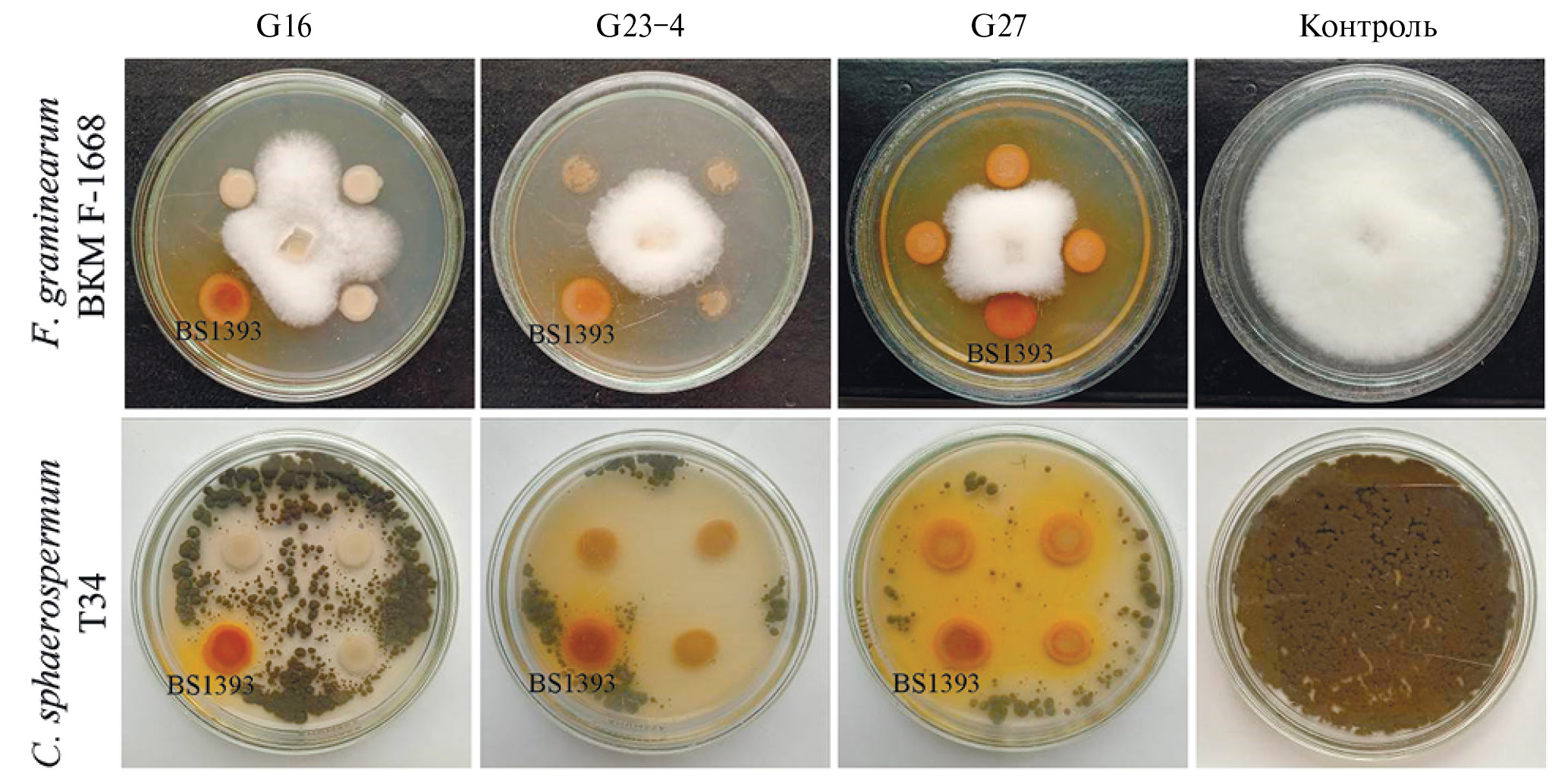 Рис. 1. Антагонистическая активность отобранных ризосферных штаммов по отношению к фитопатогенным грибам Fusarium graminearum ВКМ F-1668 и Cladosporium sphaerospermum T34. На чашке нанесены контрольный штамм P. chlororaphis BS1393, продуцент феназиновых антибиотиков, и исследуемые штаммы G16, G23-4, G27 в трех повторностях.