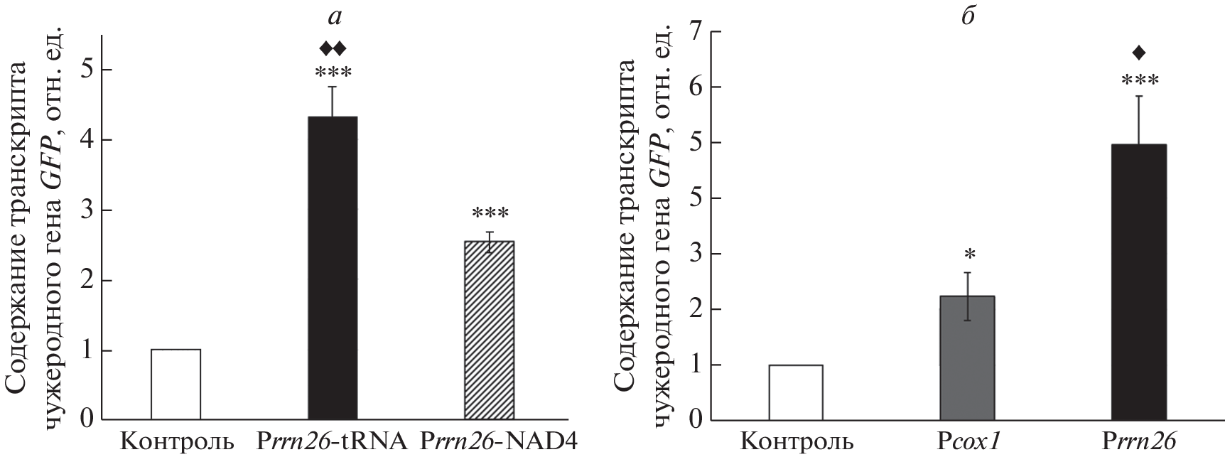 Genetic transformation of higher eukaryotes mitochondria in vivo is one of the unresolved and important problems. For efficient expression of foreign genetic material in mitochondria, it is necessary to select regulatory elements that ensure a high level of transcription and transcript stability. This work is aimed at studying the effectiveness of regulatory elements of mitochondrial genes flanking exogenous DNA using the phenomenon of natural competence of plant mitochondria. For this purpose, genetic constructs carrying the GFP gene under the control of the promoter regions of the RRN26 or COX1 genes and one of the two 3'-untranslated regions (3'-UTR) of mitochondrial genes were imported into isolated Arabidopsis mitochondria, followed by transcription in organello. It was shown that the level of GFP expression under the control of promoters of the RRN26 or COX1 genes in organello correlates with the level of transcription of these genes observed in vivo. At the same time, the presence of the tRNAТrp sequence in the 3'-UTR leads to a higher level of the GFP transcript than the presence in this region of the 3'-UTR of the NAD4 gene containing the binding site of the MTSF1 protein. The results obtained open up prospects for creating a system for efficient transformation of the mitochondrial genome.