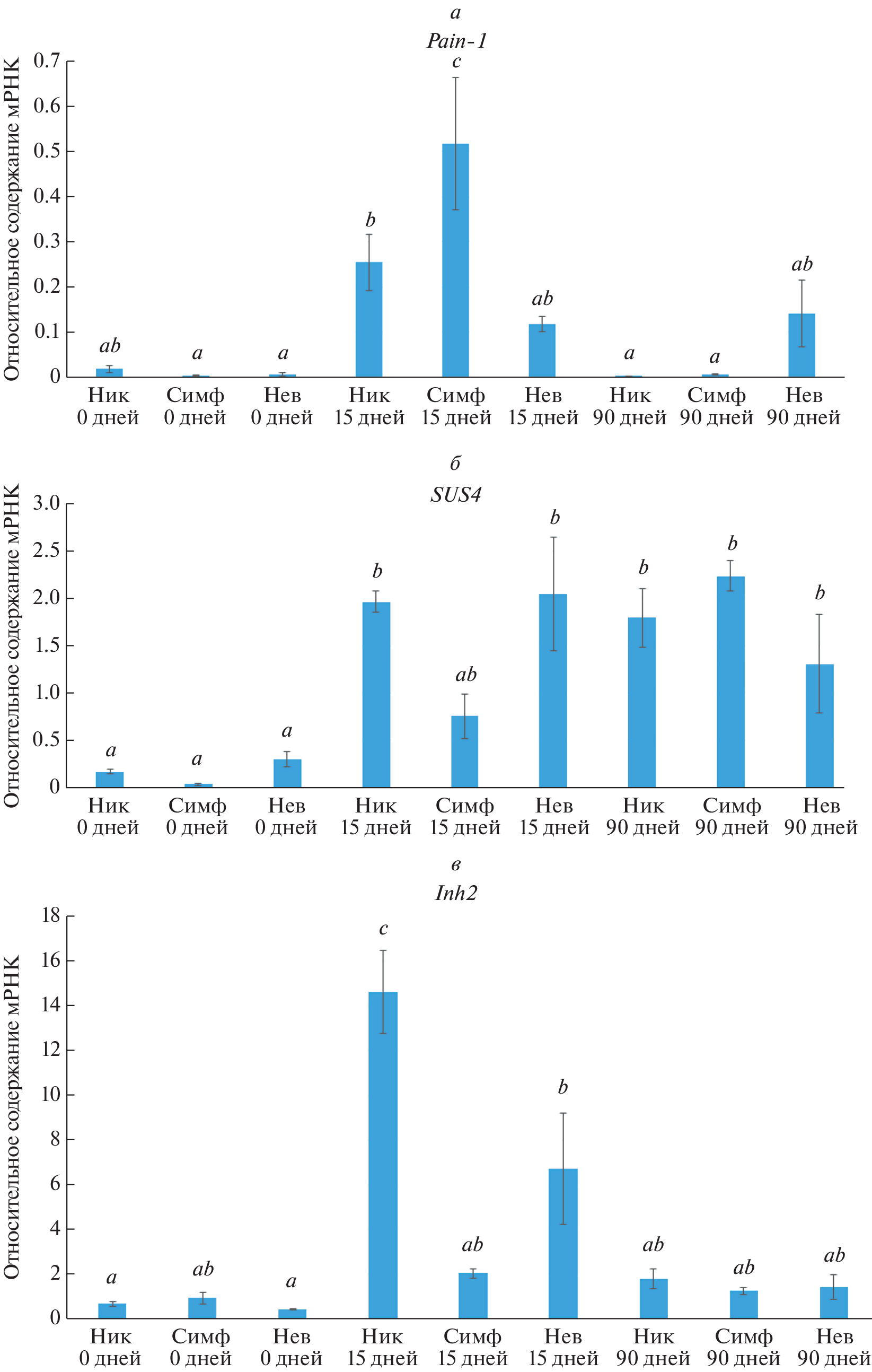 Increasing the shelf life of potato tubers demands their storage under low temperature. However, storage at low temperatures causes activation of cold-protective mechanism, so-called cold-induced sweetening (CIS). During this process, the starch is converted into reducing sugars such as glucose and fructose. Upon processing at high-temperature, these sugars react with free amino acids, resulting in brown, bitter-tasting products, which reduces the consumer value of potatoes. In this study, we performed expression analysis of genes associated with cold-induced sweetening in potato tubers: vacuolar invertase (Pain-1), sucrose-synthase (SUS4), invertase inhibitor (InvInh2). Potato varieties Nikulinsky, Symphony, Nevski were used. All three varieties were found to accumulate sugars at low temperatures, the maximum accumulation of reducing sugars being observed at 4°C. It was found that the expression pattern of genes associated with cold-induced sweetening differs depending on the variety and storage duration. The increased expression of vacuolar invertase and its inhibitor is more pronounced at the beginning of storage period while the increased expression of sucrose synthase is more pronounced after three months of storage. At early storage periods, high expression of invertase and low expression of inhibitor is observed in Dutch variety Symphony, and vice versa in Russian varieties Nikulinsky and Nevsky. The participation of the studied genes in the process of cold-induced sweetening is discussed.