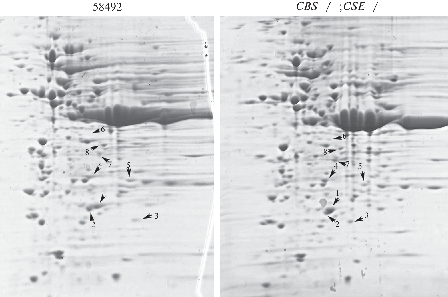 The enzymes involved in the transsulfuration pathway and hydrogen sulfide production – cystathionine-β-synthase (CBS), cystathionine-γ-lyase (CSE) and 3-mercaptopyruvate sulfurtransferase (3-MST) – play an important cytoprotective role in the functioning of the organism. Using CRISPER/Cas9 technology, we obtained Drosophila lines with deleted cbs, cse, and mst genes as well as with double deletion of cbs and cse genes. We analyzed the effect of these mutations on the pattern of protein synthesis in the salivary glands of third instar larvae and in the ovaries of mature flies. In the salivary glands of lines with cbs and cse deletions, a decrease was found in the accumulation of the FBP2 storage protein containing 20% methionine amino acid residues. In the ovaries, changes were detected in the level of expression and isofocusing points of proteins involved in cell protection against oxidative stress, hypoxia, and protein degradation. It was shown that in the lines with deletions of transsulfuration enzymes the proteins have a similar degree of oxidation to that of the control line. A decrease in the total number of proteasomes and their activity was found in the lines with deletions of the cbs and cse genes.