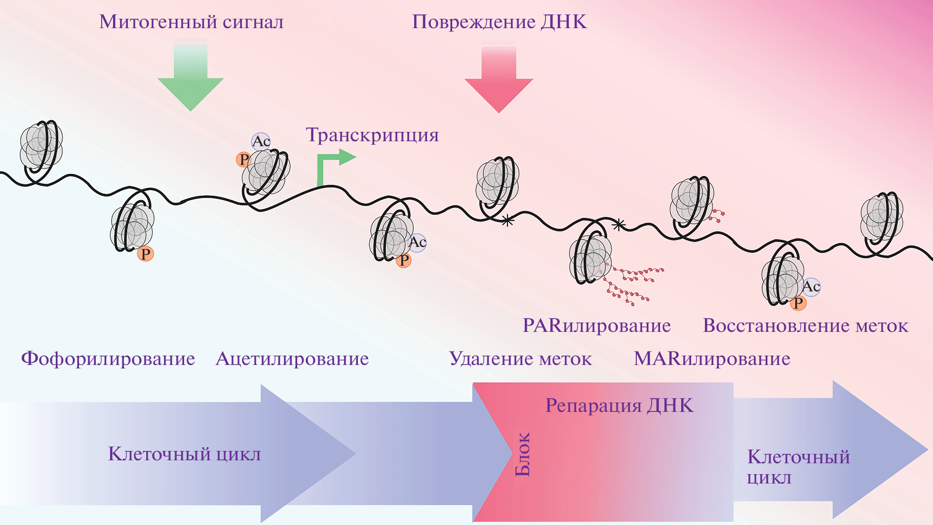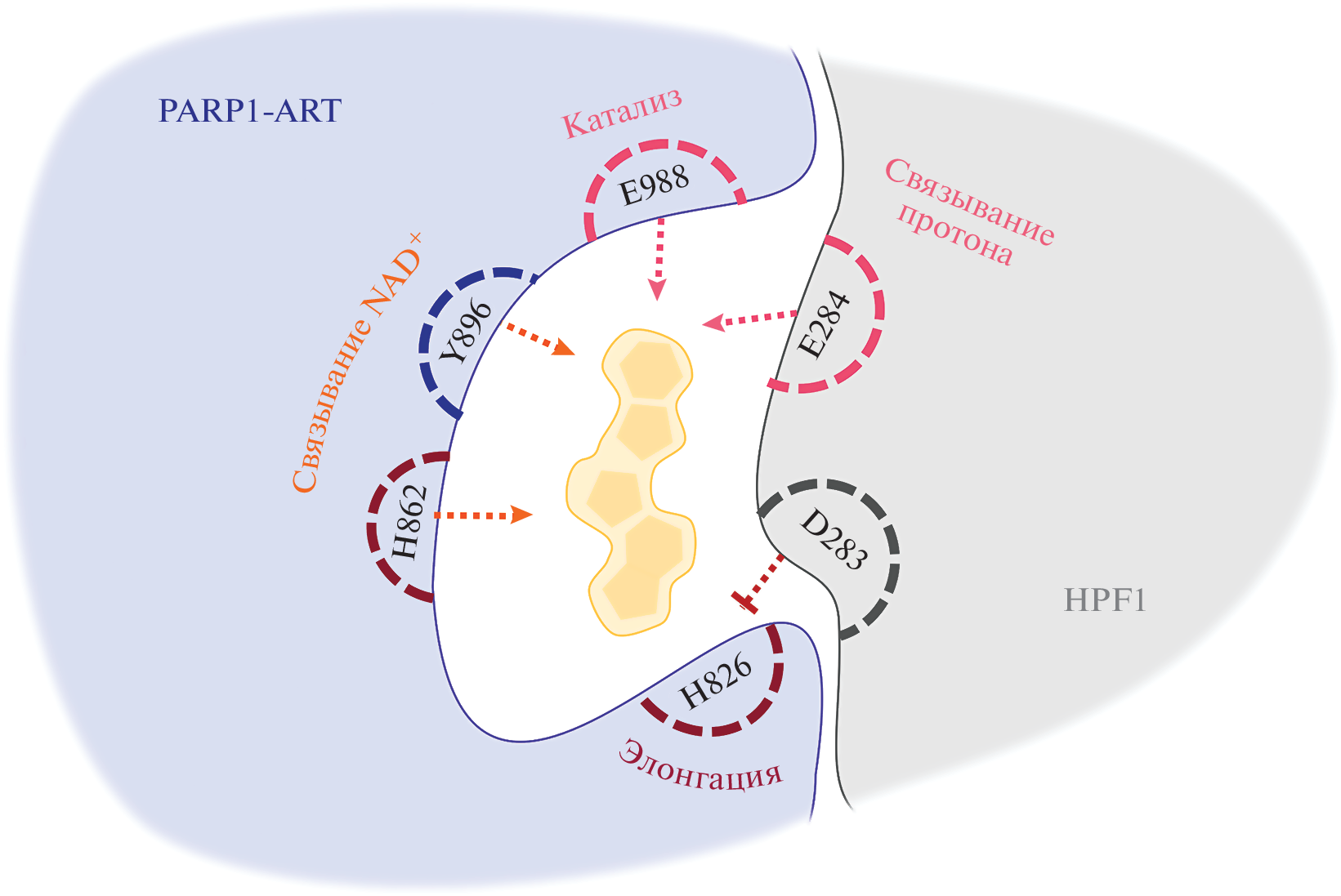 Поли(ADP-рибоза) (PAR) – отрицательно заряженный полимер, линейный и разветвленный, состоящий из мономеров АDP-рибозы. Синтез этого полимера катализируют ферменты поли(ADP-рибоза)полимеразы (PARP) при активации на повреждениях ДНК, используя в качестве субстрата никотинамидадениндинуклеотид (NAD+). Наиболее изучены два члена семейства PARP: PARP1 и PARP2. Эти важнейшие ядерные белки участвуют во многих клеточных процессах, в том числе в регуляции репарации ДНК. PARP1 и PARP2 катализируют как синтез, так и перенос поли(ADP-рибозы) на аминокислотные остатки белков-мишеней, в том числе проводят эффективное ауто-PARилирование. Ввиду ключевой роли в регуляции процесса репарации ДНК PARP1 и PARP2 считают перспективными мишенями для химиотерапии. Недавно открыт новый фактор PARилирования гистонов ‒ HPF1, ‒ который модулирует активность PARP1/2, образуя временный совместный активный центр с PARP1/2. В присутствии HPF1 модификация гистонов происходит по остаткам серина. Общий механизм взаимодействия HPF1 с PARP1/2 в настоящее время интенсивно исследуют. В представленном обзоре мы рассматриваем открытие и классический механизм PARилирования у высших эукариот, а также роль в данном процессе HPF1 – нового фактора PARилирования гистонов.
