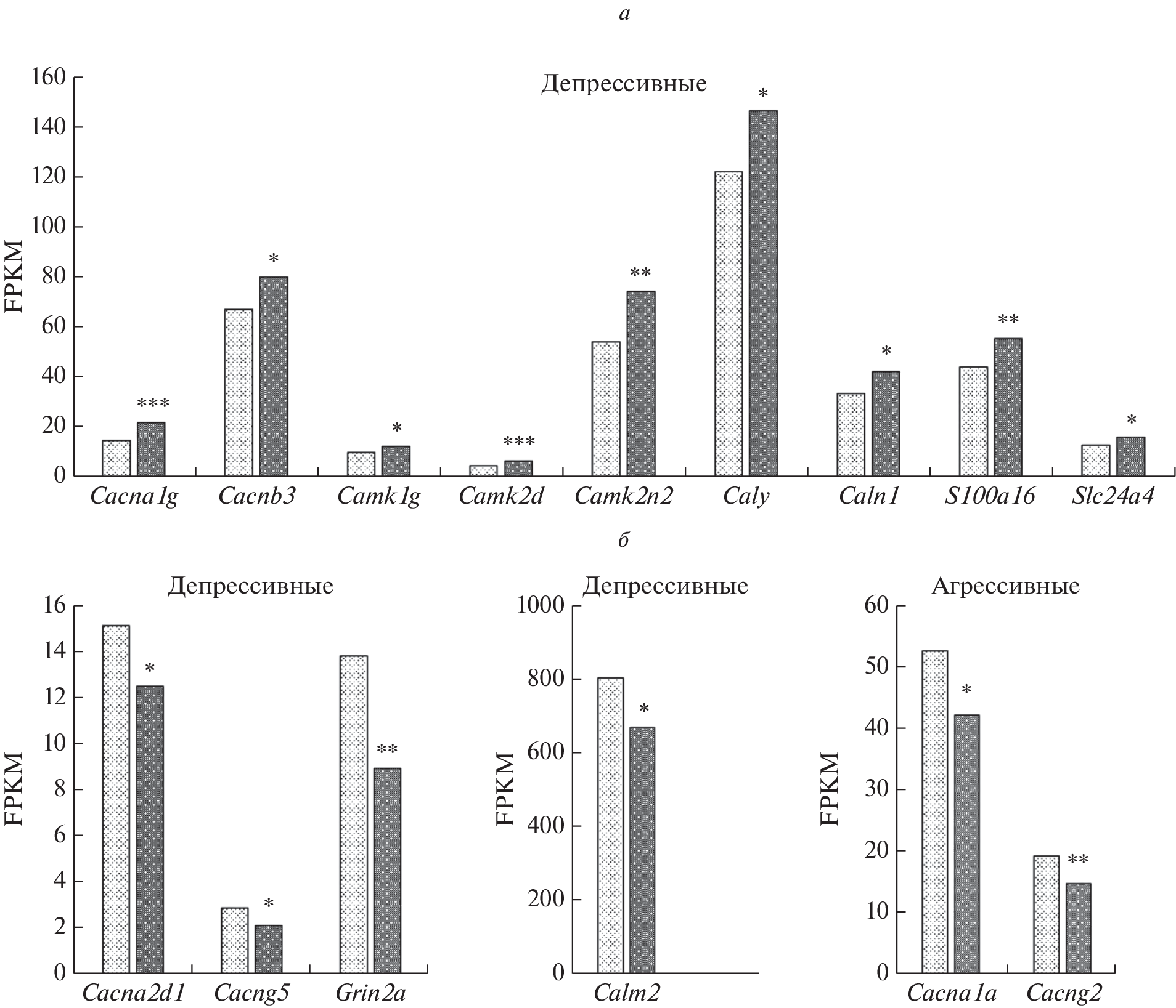 Используя данные полного транскриптомного анализа, исследовали изменение экспрессии генов, кодирующих белки, вовлеченные в процессы кальциевой регуляции, в гиппокампе самцов мышей с симптомами депрессии, вызванными хроническим социальным стрессом. Экспрессия генов Cacna1g, Cacnb3, Camk1g, Camk2d, Camk2n2, Caly, Caln1, S100a16, Slc24a4 в гиппокампе депрессивных животных была выше, а экспрессия генов Cacna2d1, Cacng5, Grin2a, Calm2 – ниже, чем в контроле. Наибольшее число значимых корреляционных взаимосвязей выявлено между экспрессией гена Сalm2, имеющего наибольшую транскрипционную активность, и других дифференциально экспрессируемых генов. Предполагается, что под влиянием хронического социального стресса происходит нарушение кальциевой сигнализации в гиппокампе мышей. Обсуждается участие в этом процессе гена Calm2 и генов Сamk1g, Camk2d и Сamk2n2.