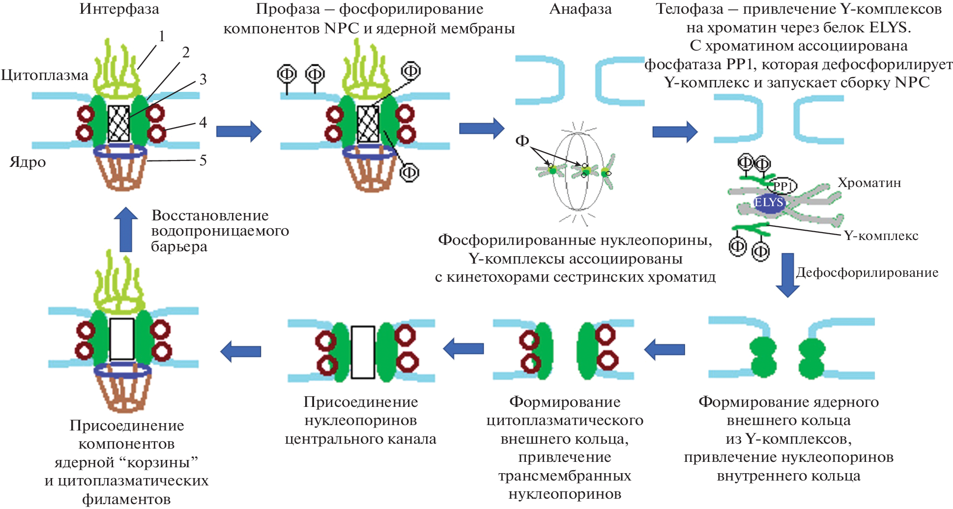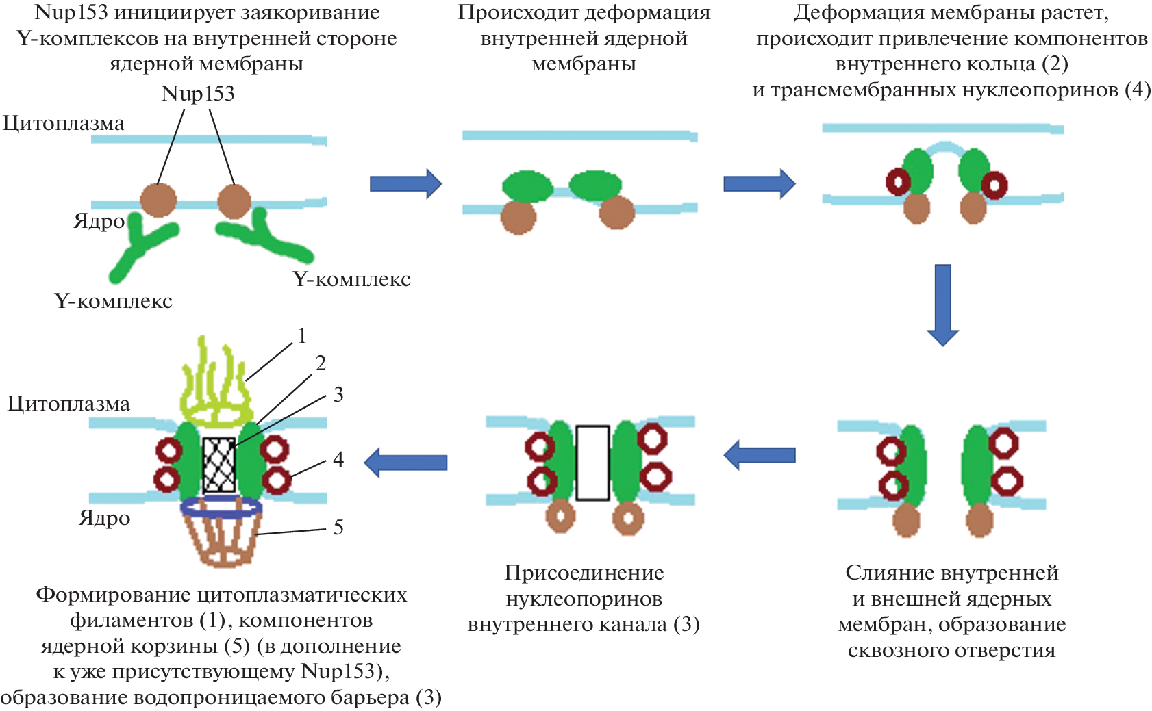 Обмен молекулами между основными компартментами эукариотической клетки ‒ ядром и цитоплазмой, происходит через комплексы ядерной поры (Nuclear Pore Complex, NPC), пронизывающие двуслойную ядерную мембрану. NPC – сложная многобелковая структура с центральным каналом, имеющая октагональную симметрию и состоящая из нуклеопоринов. Каждый из нуклеопоринов в составе NPC представлен большим количеством копий. В сквозном канале в центре NPC образуется водопроницаемый барьер, который обеспечивает способность NPC к селективному и быстрому перемещению молекул с одной стороны ядерной оболочки на другую. В основе структурной организации NPC лежит иерархический принцип. Нуклеопорины объединены в комплексы, которые служат мономерами для формирования октамеров основных структурных элементов NPC. В нашем обзоре рассмотрены структура и сборка NPC, механизм которой зависит от стадии клеточного цикла.
