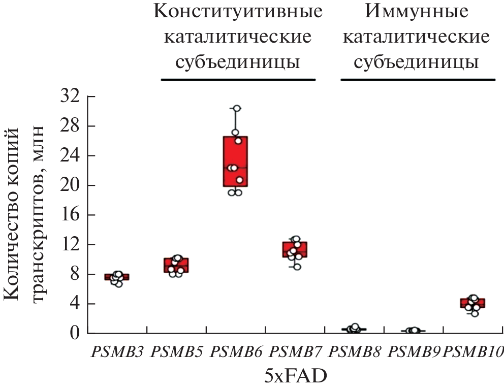 The ubiquitin-proteasome system (UPS) provides hydrolysis of most intracellular proteins in proteasomes. There are various forms of proteasomes differing, among other things, in the set of proteolytic subunits and the presence of activators. Alzheimer’s disease (AD) is characterized by disturbances in the functional state of the UPS. At the same time, an increase in the expression of certain forms of proteasomes, in particular, proteasomes containing immune subunits (non-constitutive proteasomes), was shown. Here, we studied dynamic changes in the expression of catalytic proteasome subunit genes and protein content in the cerebral cortex of animals using a mouse model of AD (5xFAD transgenic mice). In samples from 5xFAD mice, at the age of 380 days, compared with samples from mice of 60 days of age, 4 and 6 times more gene transcripts of the immune subunits PSMB9 and PSMB8 were detected, as well as a significant increase in the number of immune β-subunits (2.8 times – β1i, 2.2 times – β2i) was observed. The results obtained indicate activation of the synthesis of immune subunits and assembly of non-constitutive proteasomes at the terminal stage of pathology development. At the same time, the results of electrophoresis in native conditions indicate the activation of both 20S and 26S proteasomes containing immune subunits in samples from 5xFAD mice, 380 days of age. The obtained data, in combination with available literature, indicate that the activation of non-constitutive proteasomes is a universal phenomenon characteristic of various animal models of AD, that may reflect both the development of neuroinflammation and adaptive processes in tissues.