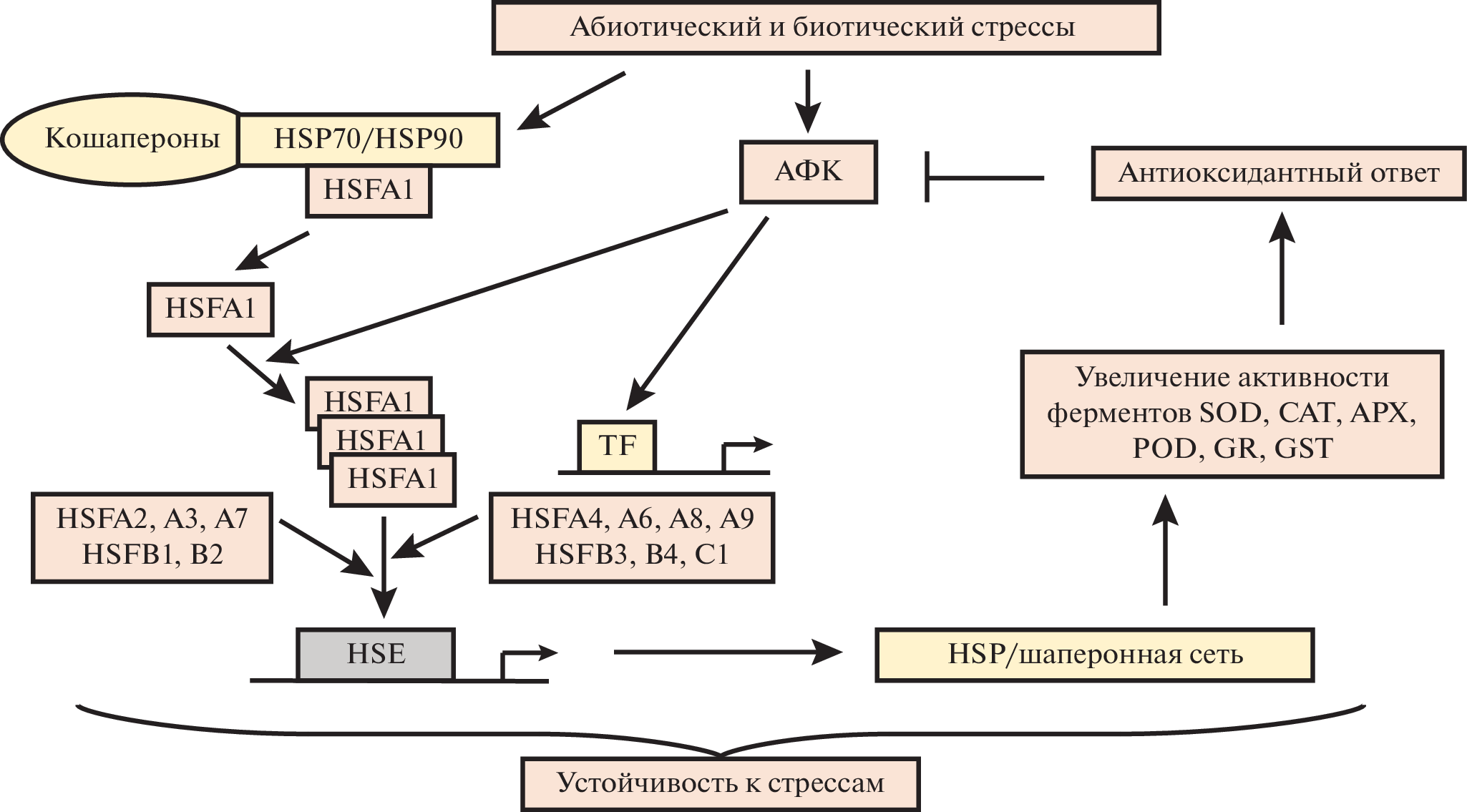 The review considers the recent progress on the role of heat shock proteins (HSPs), as well as transcription factors of heat shock proteins (HSFs) in protecting plants from oxidative stress induced by various types of abiotic and biotic stresses. HSPs are pleiotropic proteins involved in various intracellular processes and performing many important functions. In particular, HSPs increase plant resistance to stress by protecting the structure and activity of proteins of the antioxidant system. Overexpression of Hsps genes under stressful conditions, leading to an increased content of HSP, can be used as a marker of oxidative stress. Plant HSFs are encoded by large gene families with variable sequences, expression and function. Plant HSFs regulate transcription of a wide range of stress-induced genes, including HSPs and other chaperones, reactive oxygen species scavengers, enzymes involved in protective metabolic reactions and osmolytic biosynthesis, or other transcriptional factors. Genome-wide analysis of Arabidodpsis, rice, poplar, lettuce and wheat revealed a complex network of interaction between Hsps and Hsfs gene families that form plant protection against oxidative stress. Plant protection systems are discussed, with special emphasis on the role of HSPs and HSFs in plant response to stress, which will be useful for the development of technologies to increase productivity and stress resistance of plant crops.