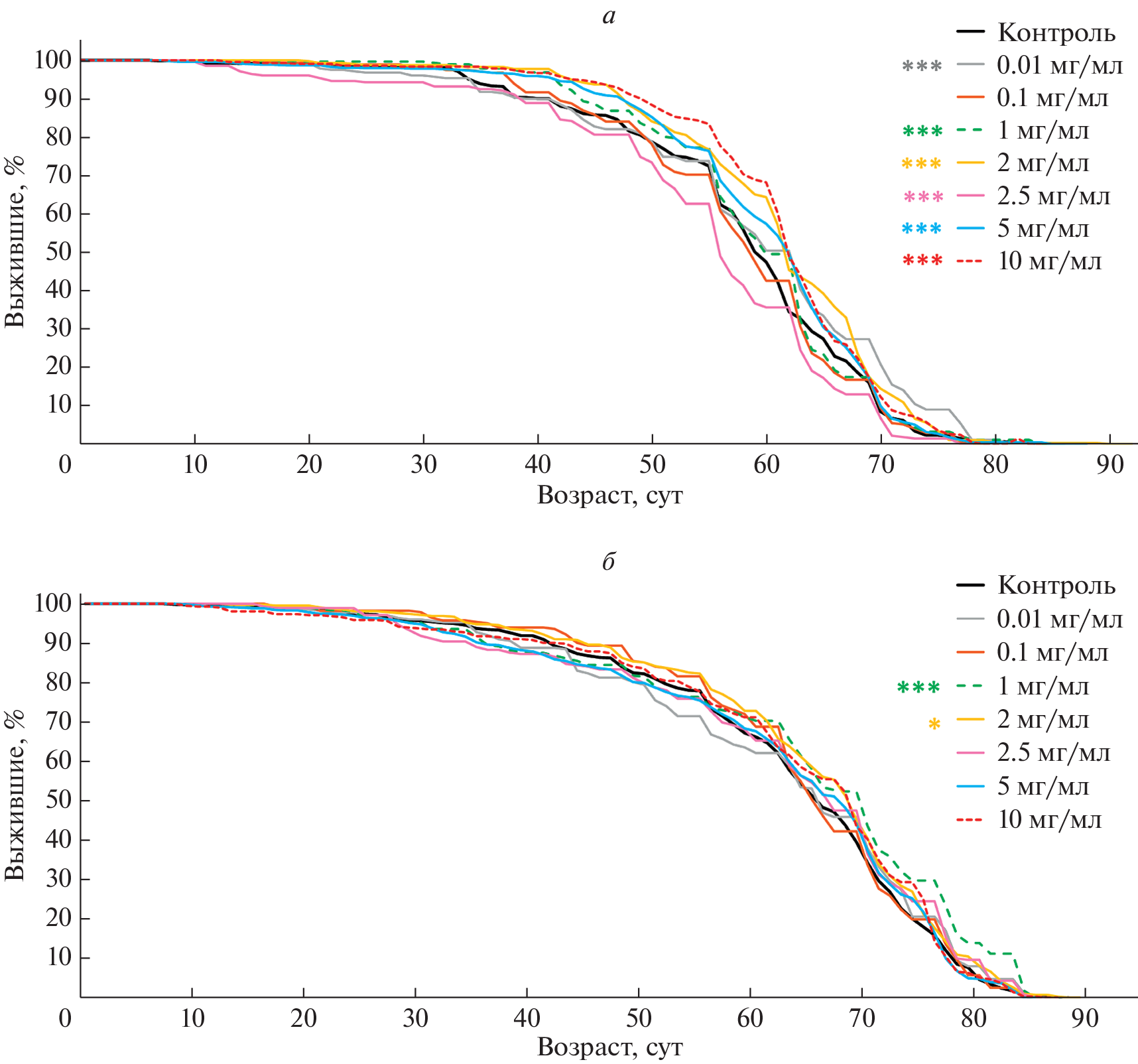 Растительные полифенолы характеризуются широким спектром биологической активности, включая антиоксидантные свойства, и имеют высокий геропротекторный потенциал. Целью работы было исследование влияния экстракта ягод рябины обыкновенной (Sorbus aucuparia L.) на продолжительность жизни и стрессоустойчивость Drosophila melanogaster с выявлением возможных механизмов его биологической активности. Установлено, что этанольный экстракт ягод S. aucuparia, основные компоненты которого рутин и цианидин-3-рутинозид, обладает выраженной антиоксидантной активностью in vitro. Обработка экстрактом ягод рябины увеличивала устойчивость самцов D. melanogaster к голоданию, но снижала устойчивость к гипертермии. У самок экстракт снижал устойчивость к окислительному стрессу, но повышал устойчивость к гипертермии. Эффекты экстракта ягод рябины на продолжительность жизни зависели как от концентрации экстракта, так и от пола дрозофил. В ответ на обработку экстрактом ягод рябины у самцов и самок D. melanogaster обнаружены незначительные различия в фоновом уровне экспрессии генов клеточного ответа на стресс, включая гены теплового шока (Hsp27, Hsp68, Hsp83), устойчивости к окислительному стрессу (tgo/Hif1, cnc/Nrf2, Sod1), циркадных ритмов (Clk, per) и ген долголетия Sirt1, что может объяснять различия в наблюдаемых эффектах.