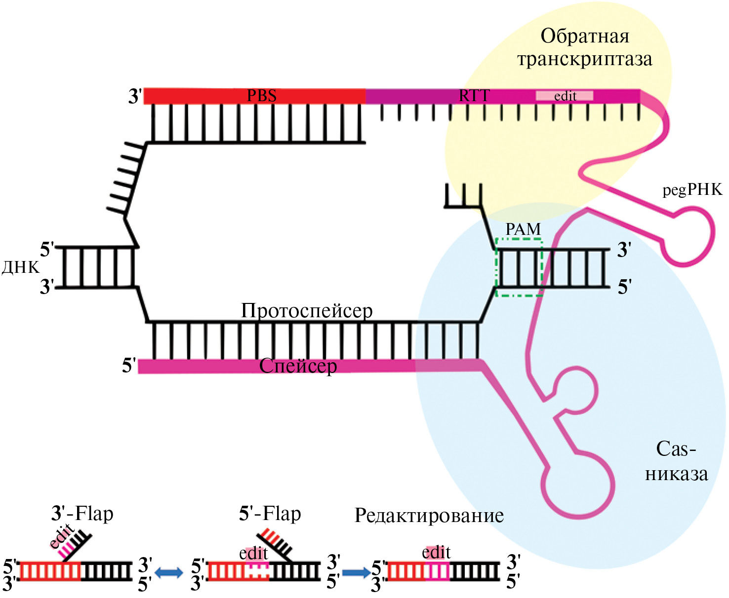 В 2019 г. было опубликовано описание сразу нескольких вариантов нового метода РЕ [4]. Все эти варианты основаны на использовании химерного белка, состоящего из никазы nCas9 (H840A), сшитой с обратной транскриптазой вируса лейкоза мышей Молони (M-MLV). При этом оба белка несли сигналы ядерной локализации (Nuclear Localization Signal, NLS) вируса SV40. Никаза nCas9 – это производное нуклеазы Cas9 дикого типа, узнающей прилежащий к протоспейсеру мотив PAM (Protospacer Аdjacent Мotif), участок NGG бактерии Streptococcus pyogenes. У никазы nCas9 нарушен домен HNH, тогда как домен RuvC остается каталитически активным, что определяет формирование этим ферментом только одноцепочечного разрыва. Химерный белок позволяет применять видоизмененную (удлиненную) гидовую РНК, так называемую pegРНК, несущую на 3ꞌ-конце дополнительную последовательность, состоящую из нескольких зон, одна из которых – PBS (сайт связывания праймера, Primer Binding Site) – служит местом отжига праймера – фрагмента редактируемого участка ДНК со свободным 3ꞌ-концом, образующимся при никировании мишени nCas9 и расплетании цепей под действием этого фермента. Другая зона pegРНК – RTT (Reverse Transcriptase Template) – представляет собой матрицу с намеченными изменениями нуклеотидных последовательностей для ее копирования обратной транскриптазой. Кроме того, в состав RTT входит участок HA (Homologous Arm), гомологичный ДНК-мишени за пределами места непосредственного редактирования, служащий для облегчения интеграции внесенных изменений в исходную последовательность ДНК. В результате такого РЕ образуются два типа цепей ДНК с так называемыми лоскутами (Flap). Причем один из них (3ꞌ-Flap) несет отредактированную последовательность, тогда как 5ꞌ-Flap представляет собой неизмененную исходную ДНК. В результате репарационных процессов в самой клетке происходит восстановление цельных последовательностей ДНК как подвергнутых редактированию, так и исходных, что, к сожалению, заметно снижает эффективность РЕ. Однако существует мнение, что 5ꞌ-Flap более подвержен воздействию структурно-специфичных эндонуклеаз и 5ꞌ-экзонуклеаз самой клетки. Описанный процесс схематично изображен на рис. 1. Нужно еще заметить, что вносить изменения в участок PAM желательно таким образом, чтобы исключить его дальнейшее узнавание никазой Cas9 и тем самым остановить возможное продолжение (повторного) редактирования.