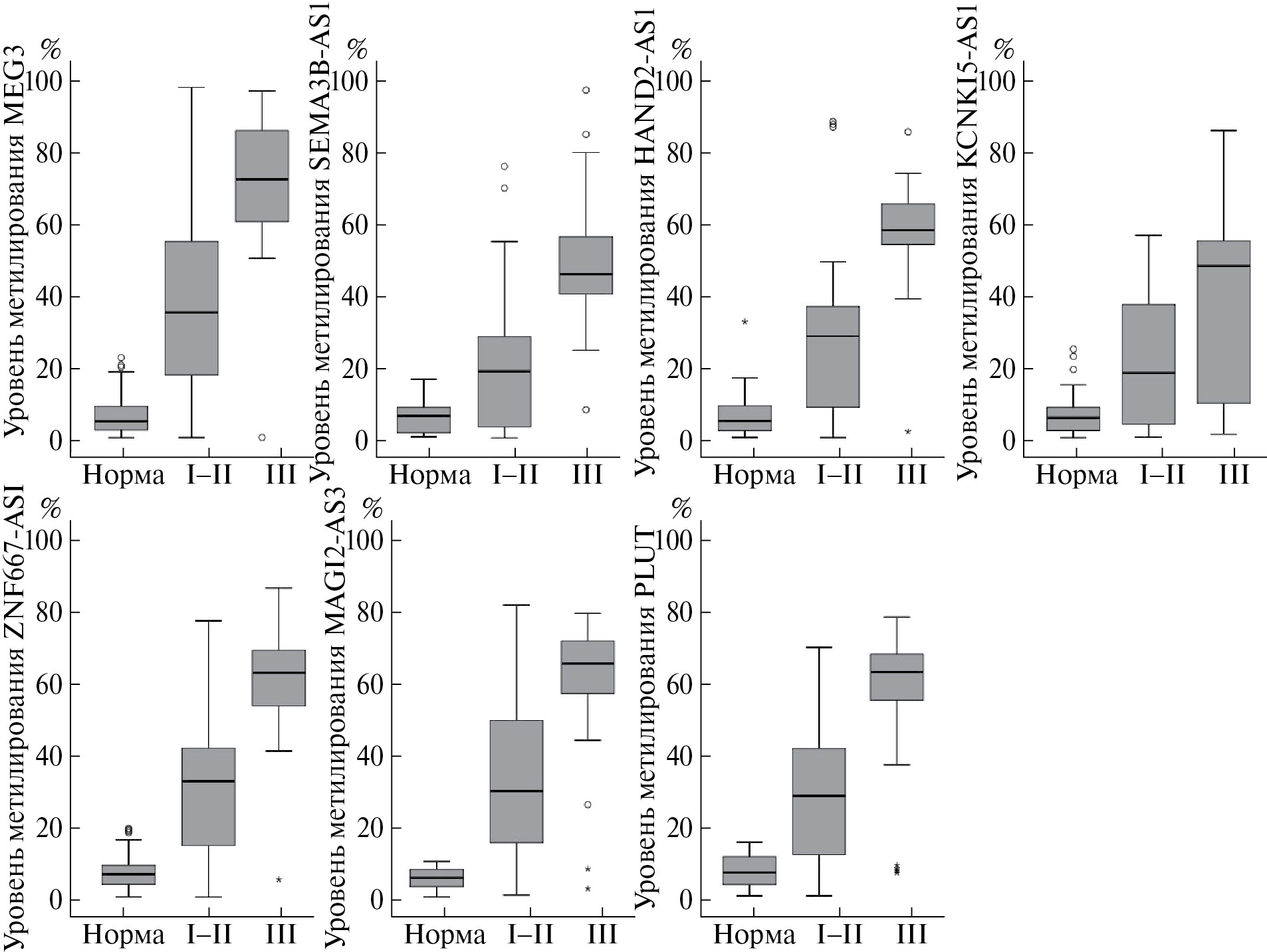 Рис. 2. Уровень метилирования генов днРНК MEG3, SEMA3B-AS1, HAND2-AS1, KCNK15-AS1, ZNF667-AS1, MAGI2-AS3 и PLUT в образцах опухолей молочной железы на поздней стадии РМЖ (III) по сравнению с ранними стадиями РМЖ (I–II) и нормальными тканями.