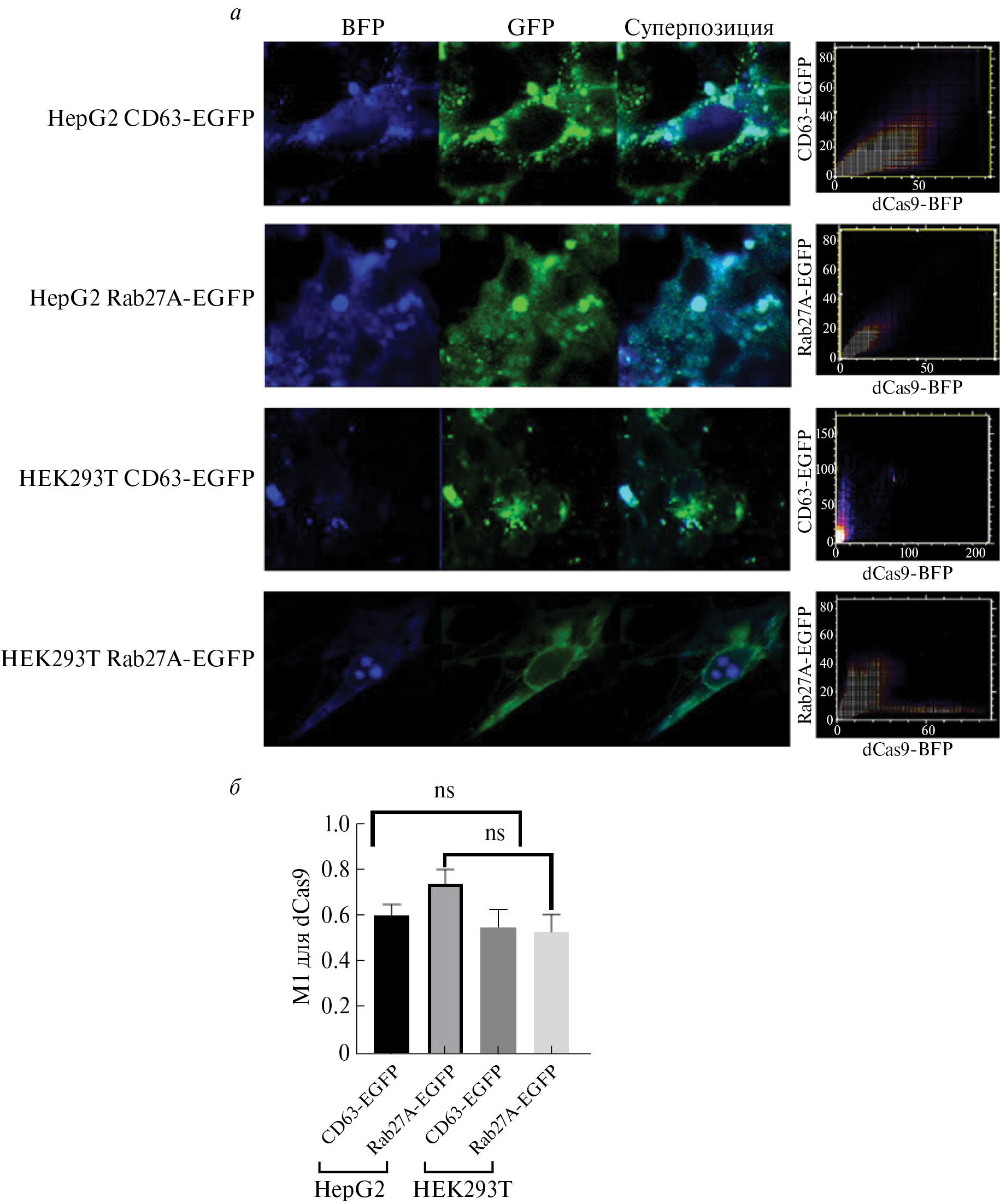 Рис. 2. Оценка уровней колокализации белка dCas9-BFP с факторами биогенеза экзосом в линиях клеток HEK293T и HepG2. а – Репрезентативные конфокальные изображения клеток, трансфицированных dCas9-BFP с CD63-EGFP либо Rab27А-EGFP. В крайнем правом ряду представлены цитофлуорограммы светимости dCas9-BFP и CD63-GFP либо Rab27А-EGFP. б – Полуколичественные данные колокализации dCas9-BFP с белками CD63-EGFP и Rab27А-EGFP, рассчитанные с помощью коэффициента М1. Планки погрешностей соответствуют стандартным отклонениям.