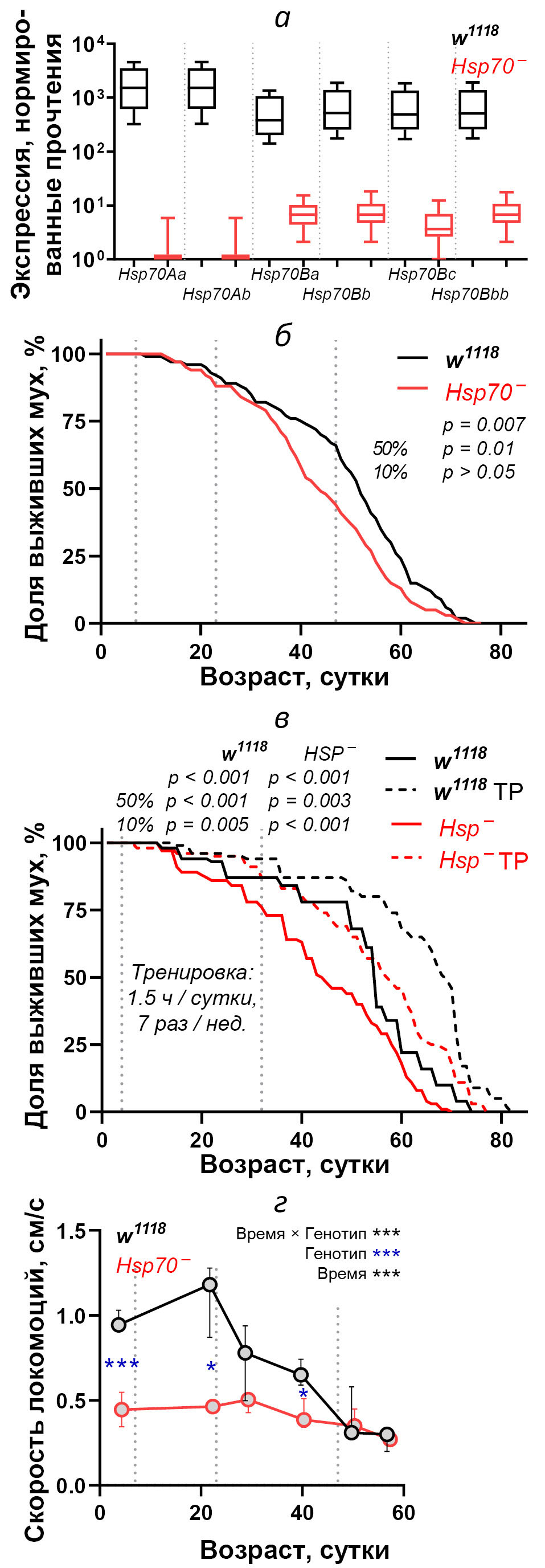 Делеция шести генов Hsp70 уменьшила медианную продолжительность жизни мух, однако не оказала негативного влияния на прирост продолжительности их жизни, вызванный длительным повышением двигательной активности. Это свидетельствует о контекстспецифичном и небольшом влиянии нокаута генов Hsp70 на продолжительность жизни мух. Напротив, в тесте на отрицательный геотаксис (показатель, характеризующий выносливость) скорость локомоций у мух Hsp70– была значительно снижена, что происходило на фоне комплексных изменений возрастной динамики транскриптома мышц ног. Количественный протеомный анализ выявил у 47-суточных мух Hsp70– разнонаправленные изменения в содержании ключевых ферментов метаболизма глюкозы и окисления жиров (гликолиз, пентозофосфатный путь, цикл Кребса, бета-окисление и окислительное фосфорилирование). Такая дисрегуляция может быть связана с компенсаторным увеличением экспрессии генов, кодирующих другие шапероны (этого и других семейств), которые регулируют специфичные для них наборы белков-мишеней.