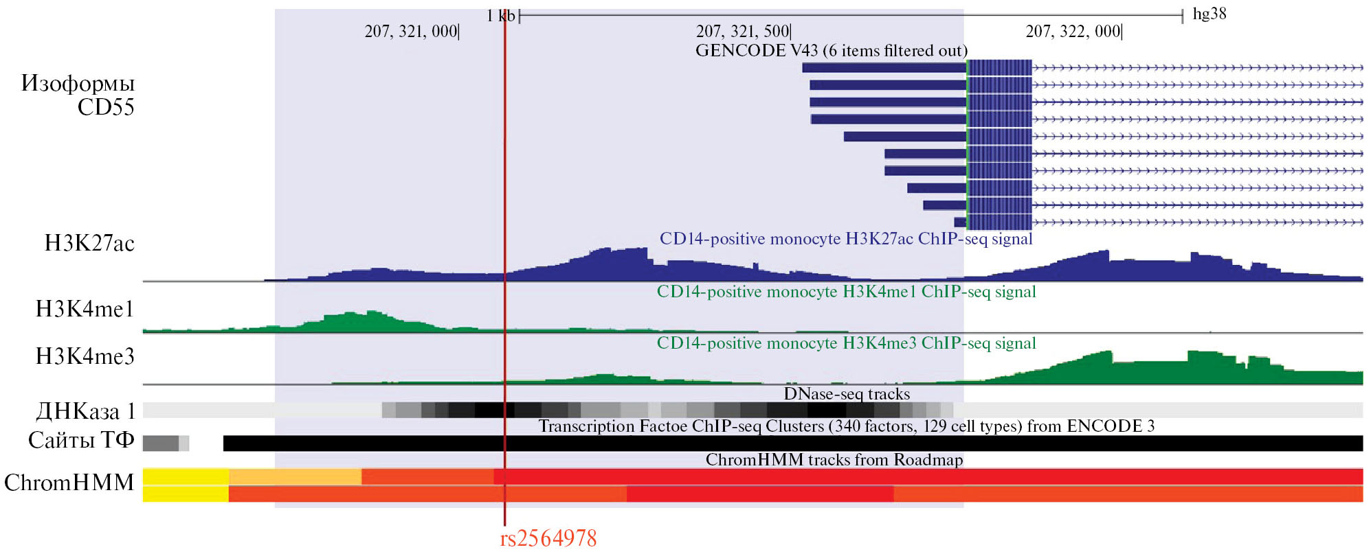 Рис. 1. Схематическое изображение расположения rs2564978 в промоторе гена CD55, визуализированное с помощью UCSC Genome Browser (GRCh38/hg38). Синим обозначена область промотора гена CD55. Красной вертикальной линией обозначено местонахождение однонуклеотидного полиморфизма rs2564978. Гистограммы показывают расположение модификаций гистонов, ассоциированных с активными регуляторными участками генома (моно/триметилирование H3K4, ацетилирование H3K27; Roadmap), в CD14+ моноцитах. Прямоугольниками отмечены кластеры гиперчувствительности к ДНКазе I в CD14+ моноцитах и сайты связывания транскрипционных факторов (ChIP-seq ENCODE). ChromHMM характеризует активность хроматина в нескольких субпопуляциях CD14+ моноцитов (по данным Roadmap): красным и оранжевым обозначены промотороподобные, желтым – энхансероподобные области.