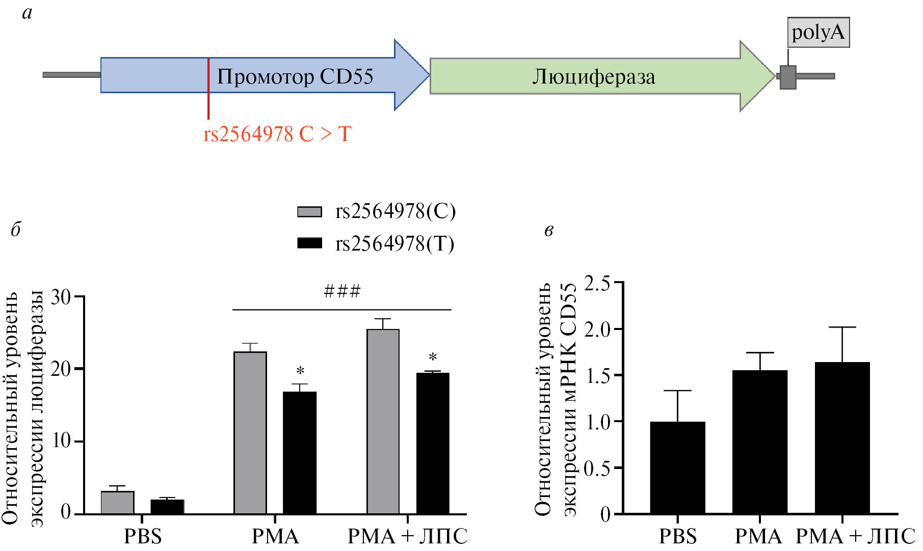 Рис. 2. Активность промотора гена CD55 снижается в присутствии минорного rs2564978(Т) аллеля в клеточной модели макрофагов. а – Схема люциферазной репортерной конструкции pGL3-basic, содержащей промотор гена CD55 с альтернативными аллелями rs2564978. б – Стимуляция моноцитов U937 с помощью PMA или PMA+ЛПС увеличивает аллель-зависимую разницу в активности промотора CD55. Экспрессия репортерной люциферазы была нормализована по экспрессии люциферазы внутреннего контроля (Renilla). в – Относительный уровень экспрессии мРНК CD55 в неактивированных U937 (PBS) и после стимуляции PMA или PMA+ЛПС. На графиках представлены результаты трех экспериментов в виде средних значений ± SEM. *P < 0.05 – различие между вариантами rs2564978(С) и rs2564978(Т), ###P < 0.0001 – различие между нестимулированными (PBS) и активированными клетками (непарный t-критерий Стьюдента).