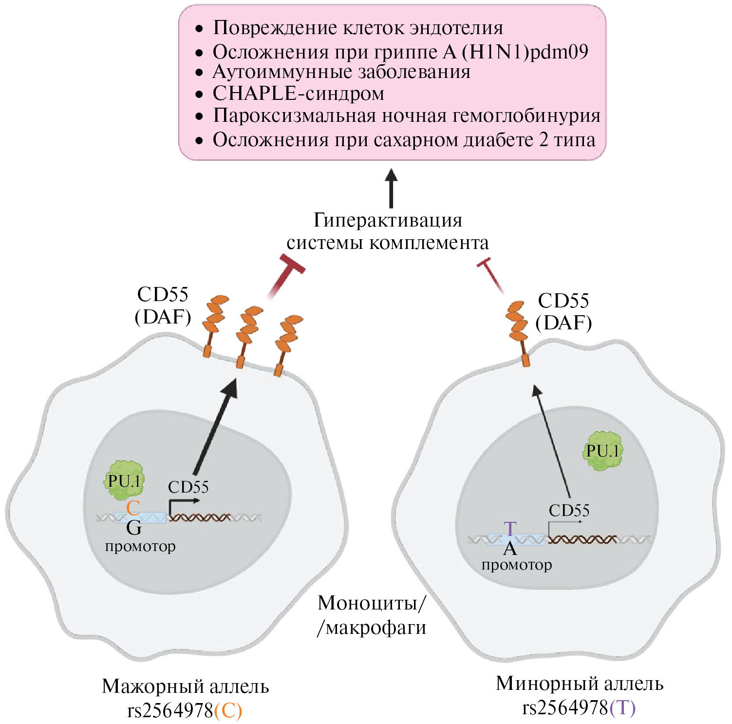 В промоторной области гена CD55 располагается однонуклеотидный полиморфизм (SNP) rs2564978(C>T), минорный Т-аллель которого ассоциирован с тяжелой формой гриппа А(H1N1)pdm09 [21‒23]. Кроме того, известно, что уровень мРНК CD55 в моноцитах инфицированных пациентов с генотипом rs2564978(TT) значительно снижен по сравнению с носителями C-аллеля [21]. При этом в репортерных тестах при наличии мажорного С-аллеля rs2564978 наблюдалось снижение активности промотора CD55 в клетках рака легкого, а в популяционных исследованиях найдена ассоциация этого варианта с повышенным риском возникновения немелкоклеточного рака легкого, рака пищевода, а также с энтеровирусным везикулярным стоматитом [24‒26].