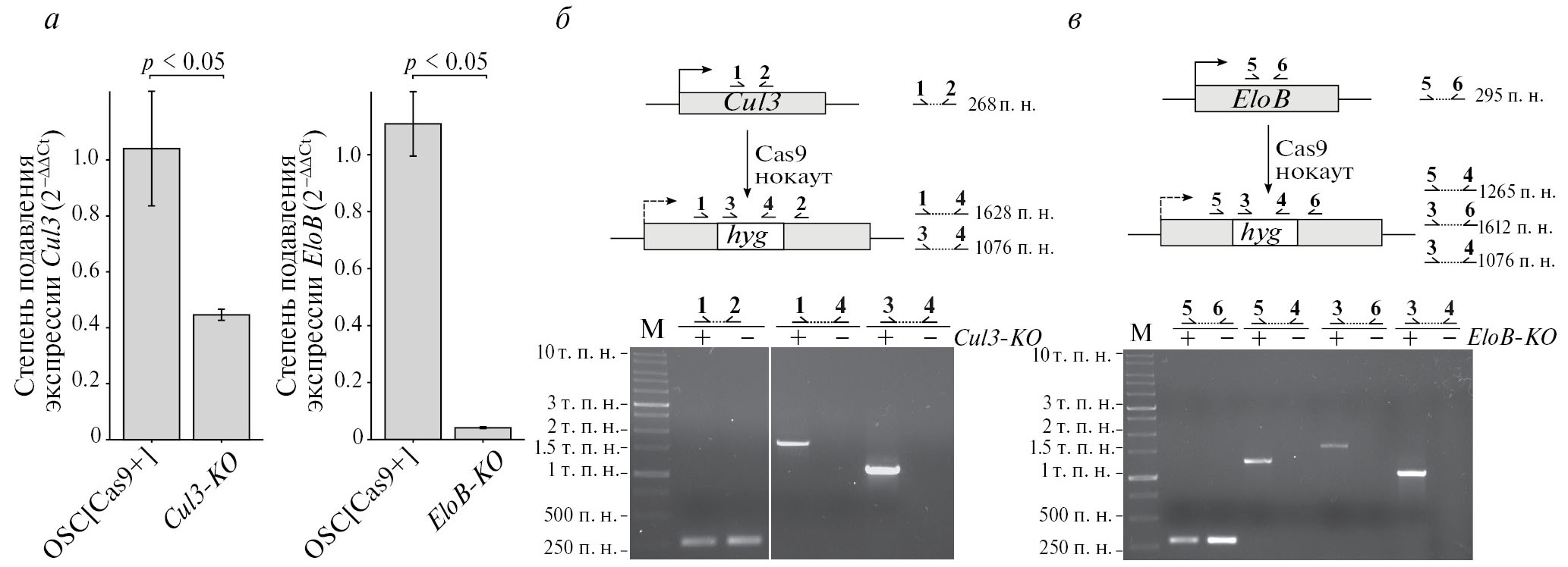 В рамках работы, направленной на изучение функций генов Cul3 и EloB, которые кодируют компоненты мультибелкового убиквитин-лигазного комплекса CRL, участвующего в регуляции многочисленных клеточных процессов [12], мы провели нокаут этих генов в культуре соматических клеток яичников OSC[Cas9+] с конститутивной экспрессией Cas9. При проведении нокаута кассету с геном устойчивости к гигромицину hyg внедрили в кодирующую часть генов Cul3 и EloB в OSC (рис. 1а). Отбор клеток со вставленной в геном кассетой проводили на среде с гигромицином. Анализ количества транскриптов в полученных культурах методом qRT-ПЦР показал, что нокаут генов приводит к падению уровня их экспрессии, но в случае Cul3-KO количество транскриптов снижается только в 2 раза, тогда как в EloB-KO – в 10 раз (рис. 1б). Можно предположить, что линия Cul3-KO, в отличие от линии EloB-KO, гетерозиготна по мутантному гену. Однако ПЦР-анализ геномов показал, что интактные аллели дикого типа сохранились в обеих линиях (рис. 1б,в). Поэтому вероятно, что более высокая степень подавления экспрессии EloB по сравнению с Cul3 при нокауте объясняется либо тем, что в линии EloB-KO гетерозиготна лишь небольшая доля клеток, либо EloB-KO является доминантной мутацией.