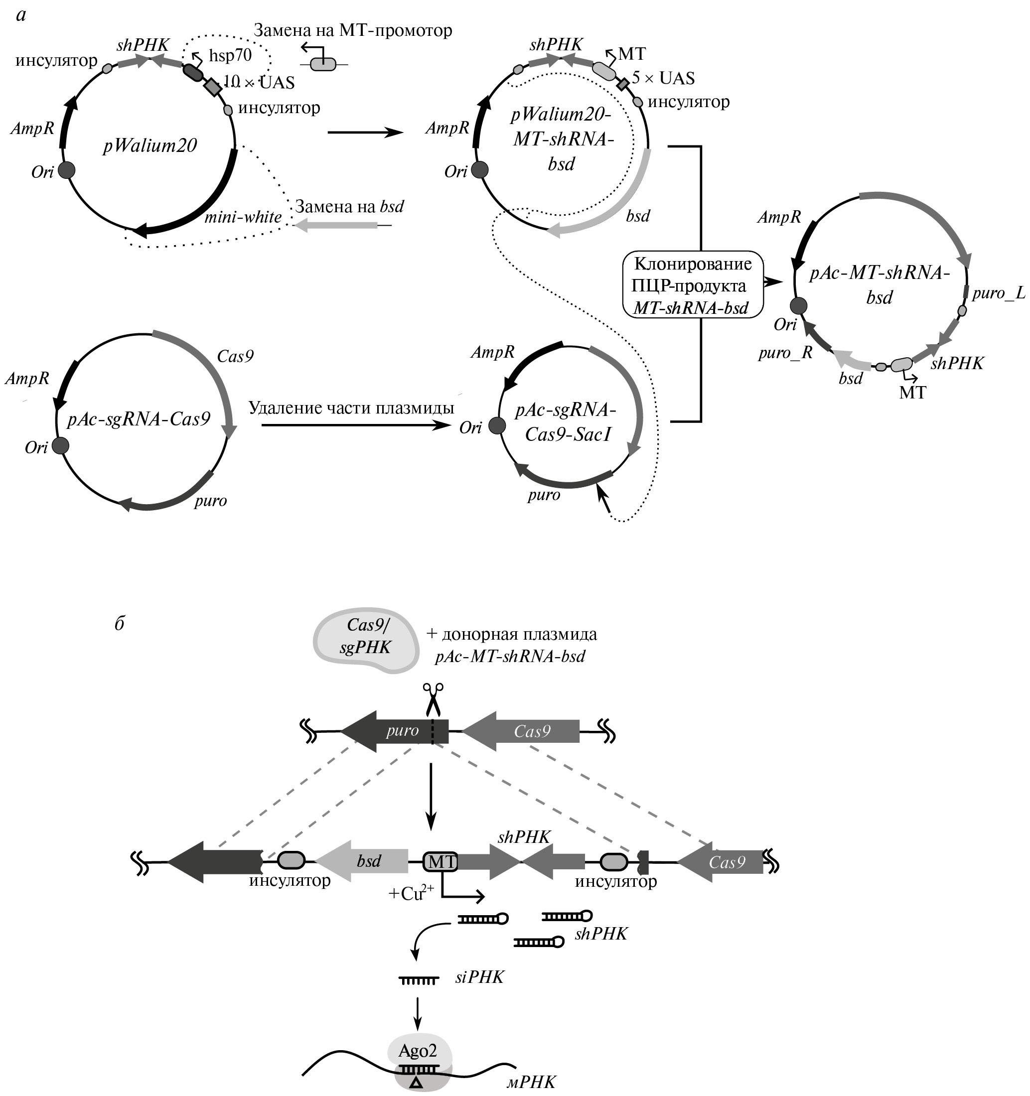 Рис. 2. Схема конструирования донорной плазмиды pAc-MT-shRNA-bsd, содержащей кассету MT-shRNA-bsd с индуцируемой shРНК (а). Подробное описание представлено в тексте и разделе Экспериментальная часть. puro_R и puro_L ‒ фрагменты гена puro в pAc-MT-shRNA-bsd, которые будут служить плечами для гомологичной рекомбинации. Кассета MT-shRNA-bsd из донорной плазмиды внедряется в предварительно встроенный в геном трансген pAc-sgRNA-Cas9 (показана его часть с генами puro и Cas9) с помощью Cas9 и активируется добавлением ионов меди (б). Экспрессирующиеся shРНК процессируются до siРНК, которые в комплексе с белком Ago2 дрозофилы связываются с комплементарной мРНК и вызывают ее расщепление по механизму РНКи.