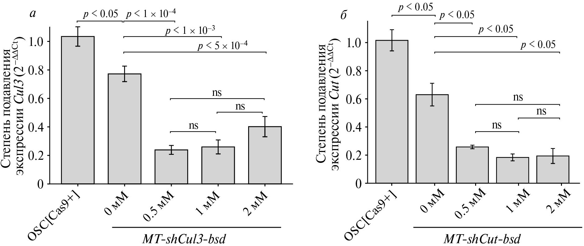 Рис. 3. Изменение уровня экспрессии генов Cul3 (а) и cut (б) при добавлении ионов меди в концентрации 0.5, 1 и 2 мМ к линиям клеток, в геном которых внедрены кассеты с соответствующими shРНК, по сравнению с экспрессией в OSC[Cas9+]. Уровень экспрессии, измеренный методом qRT-ПЦР, нормировали на экспрессию rp49. Показаны средние значения измерений по двум-трем биологическим повторностям с тремя техническими повторностями в каждом; погрешности измерения показаны стандартной ошибкой среднего. Статистическую значимость различий оценивали по методу Уилкоксона; ns ‒ различия средних статистически недостоверны.