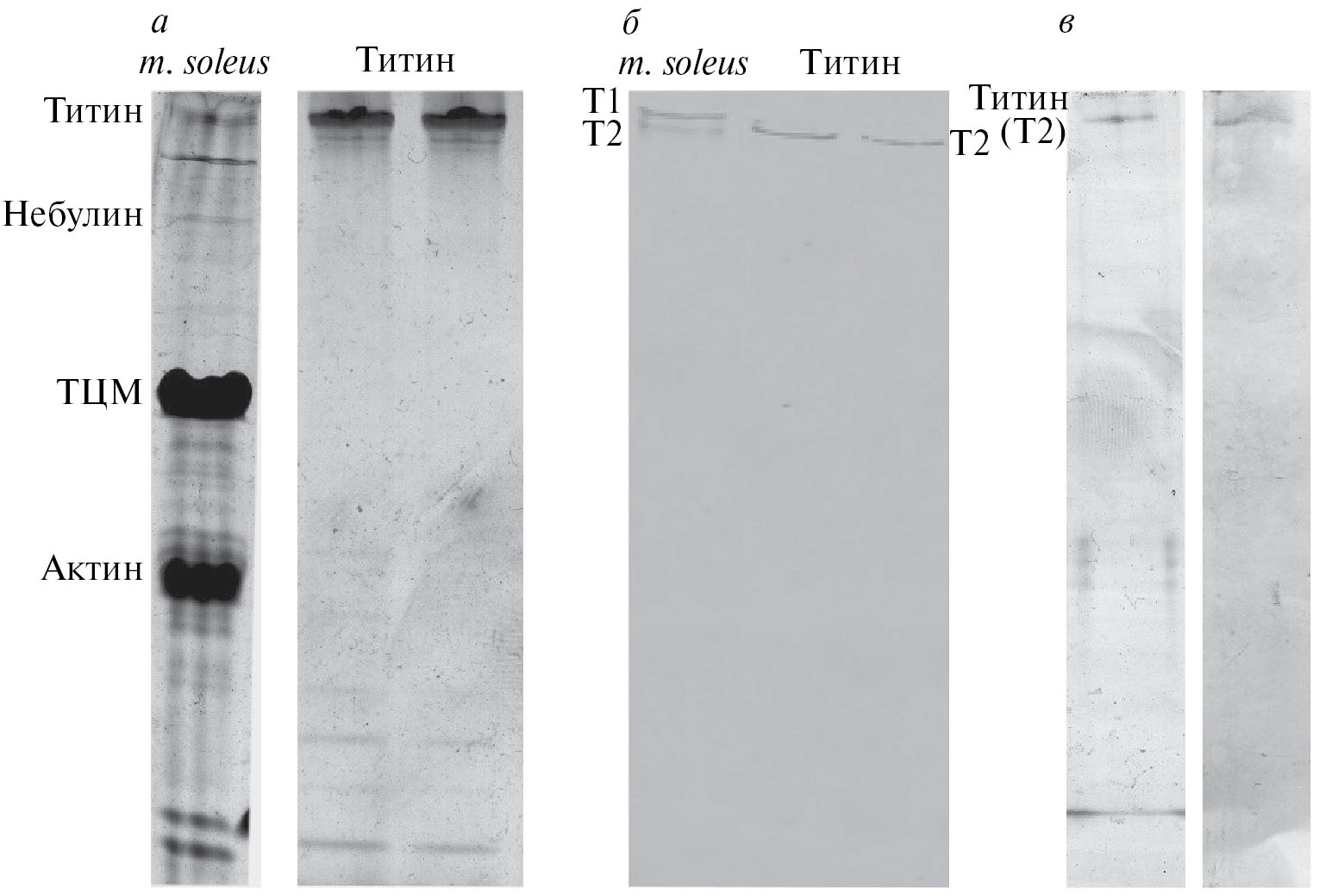 Рис. 1. ДСН-гель-электрофорез и Вестерн-блотинг титина скелетных мышц кролика. а – ДСН-ЭФ препарата очищенного титина (две правые дорожки). Левая дорожка – m. soleus кролика (контроль). Электрофорез проведен в 7%-ном полиакриламидном геле. Указаны полосы актина, тяжелых цепей миозина (ТЦМ), небулина и титина. б – Вестерн-блотинг титина с использованием моноклональных антител АВ5. Электрофорез проведен в 2.2%-ном полиакриламидном геле, укрепленном агарозой. Левая дорожка – m. soleus кролика (контроль). Две правые дорожки – очищенные препараты титина. в – ДСН-ЭФ в 7%-ном полиакриламидном геле препарата очищенного титина (дорожка слева) и Вестерн-блотинг титина с использованием моноклональных антител 9D10 (дорожка справа). Т1 – полноразмерные молекулы титина, расположенные в саркомере от M-линии до Z-диска. Т2 – фрагменты титина-1, расположенные в А-диске саркомера вдоль миозиновых нитей.