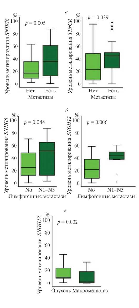 Рис. 3. Связь между повышением уровней метилирования генов днРНК SNHG6 и TINCR в образцах первичного РЯ с наличием метастазов всех типов, включая отдаленные гематогенные, лимфогенные и перитонеальные (а), и генов SNHG6 и SNHG12 с наличием лимфогенных метастазов (б). Снижение уровня метилирования SNHG12 в макроскопических перитонеальных метастазах относительно парных первичных опухолей (в). Применен непараметрический критерий Манна–Уитни.