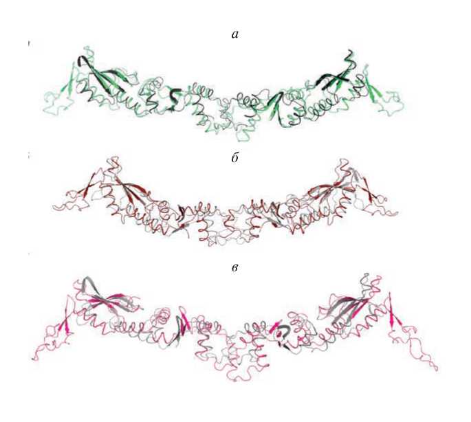 Рис. 2. Выравнивание с помощью PMOL v.1.9 структур белков ArdA с известной структурой ArdA Tn916 (PDB2W82). a – Выравнивание ArdA_At c ArdA_Tn916. б – Выравнивание ArdA_Pm c ArdA_Tn916. в – Выравнивание ArdA_Xs с ArdA_Tn916.