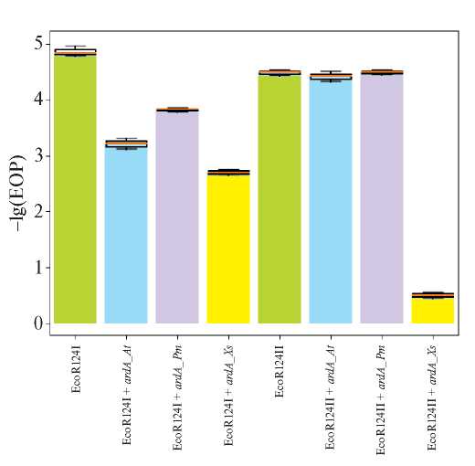 Из рис. 4 видно, что все исследованные гены снижают рестрикционный эффект EcoR124I, однако в отличие от EcoR124II присутствие гена ardA_Xs оказывает более сильное действие на систему EcoR124II. Ввиду того, что RMI-системы EcoR124I и EcoR124II существенно различаются лишь расстоянием между двумя доменами, распознающими ДНК в субъединице HsdS, можно предположить существование специфичности различных вариантов белка ArdA к архитектуре ДНК-распознающего домена субъединицы HsdS.
