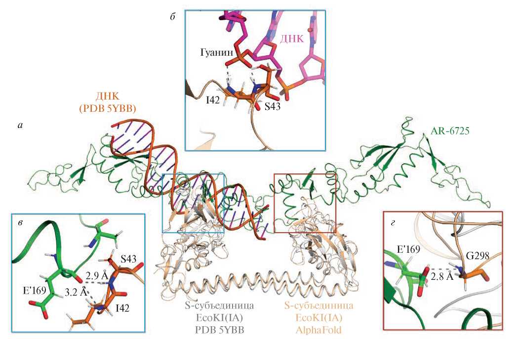 Выравнивание структур выявило возможные межбелковые контакты в местах наибольшего сближения S-субъединицы комплекса EcoKI с ДНК. Так, например, вероятными местами контактов и образования водородных связей являются аминокислотные остатки I42 и S43 S-субъединицы комплекса EcoKI и E169 ArdA_Xs (рис. 5в), рассматриваемые как потенциальная причина ингибирования рестрикционной активности EcoKI и предотвращения ее связывания с ДНК (рис. 5б). Также в “симметричном” участке S-субъединицы местом контакта являются предположительно G298 S-субъединицы комплекса EcoKI и E169 второй ArdA_Xs (рис. 5г).