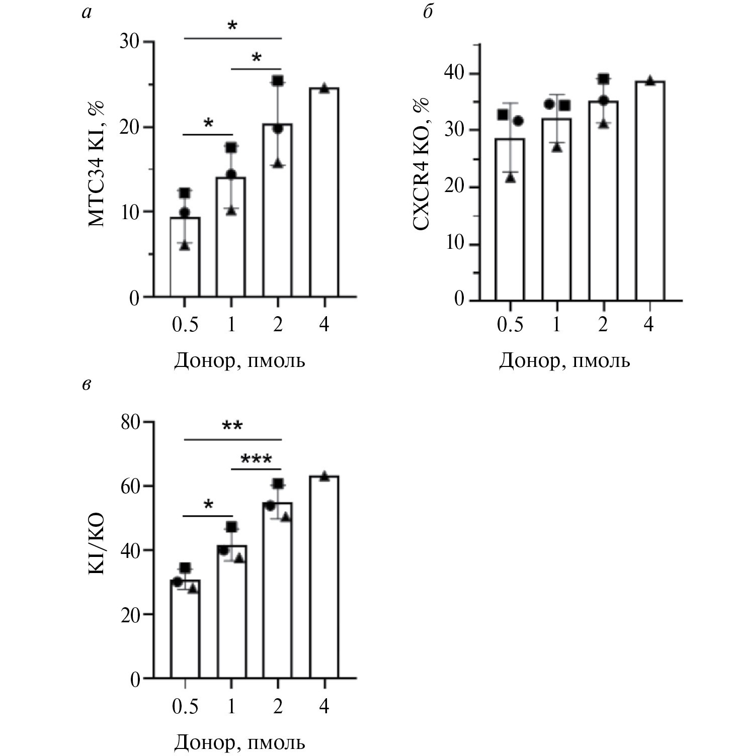 Для оценки эффективности нокина клетки CEM/R5 электропорировали донорными плазмидами вместе с плазмидами, экспрессирующими Cas9 и гРНК, и на 5 сутки оценивали уровни нокина и нокаута с помощью проточной цитофлуориметрии с антителами соответственно против пептида МТ-С34 и корецептора CXCR4. Сначала определяли уровень нокина при различных дозах донорной ДНК и неизменной концентрации плазмид для экспрессии Cas9 и гРНК. Обнаружено, что при увеличении количества донорной ДНК от 0.5 до 4 пмоль возрастал и уровень нокина (рис. 2а), а уровень нокаута значимо не изменялся (рис. 2б). В результате соотношение нокина к нокауту увеличивалось в 2 раза и достигало 60% (рис. 2в).