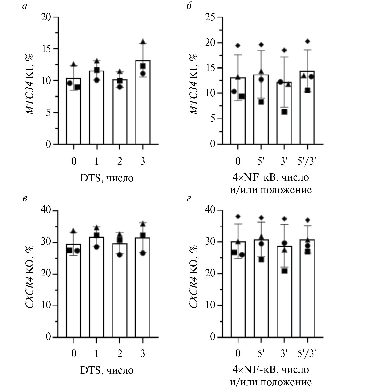 Далее оценили влияние модификаций донорной плазмиды на уровни нокина и нокаута при выбранных условиях. Оказалось, что добавление сигналов DTS или сайтов связывания NF-κB не влияет на уровень как нокина MTC34 (рис. 3а, б), так и нокаута CXCR4 (рис. 3в, г).