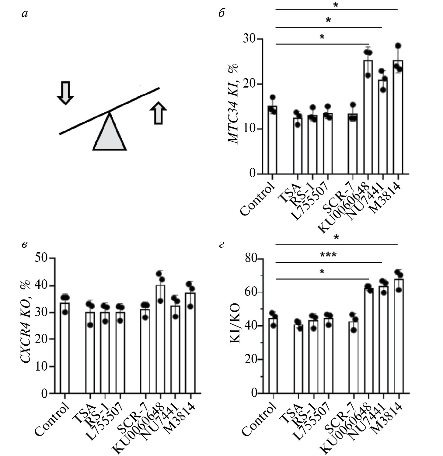 Для повышения уровня нокина часто используют низкомолекулярные соединения, влияющие на пути репарации двухцепочечных разрывов ДНК [16]. Учитывая это, для повышения уровня нокина MTC34 в локус CXCR4 мы проанализировали ряд соединений, которые, согласно данным литературы, повышают уровень репарации по механизму HDR или блокируют NHEJ. В качестве активаторов HDR использовали соединение RS-1, стабилизирующее Rad51-нуклеофиламенты [22]; агонист β-3 адренергического рецептора L755507 (механизм его влияния на HDR неизвестен) [16] и ингибитор гистондеацетилаз трихостатин А (Trichostatin A, TSA) [23]. Для блокировки NHEJ использовали ингибиторы ДНК-зависимой протеинкиназы (DNA-PK) Ku0060648, Nu7441 и M3814 и ингибитор ДНК-лигазы IV SCR7 [23] (рис. 5а).