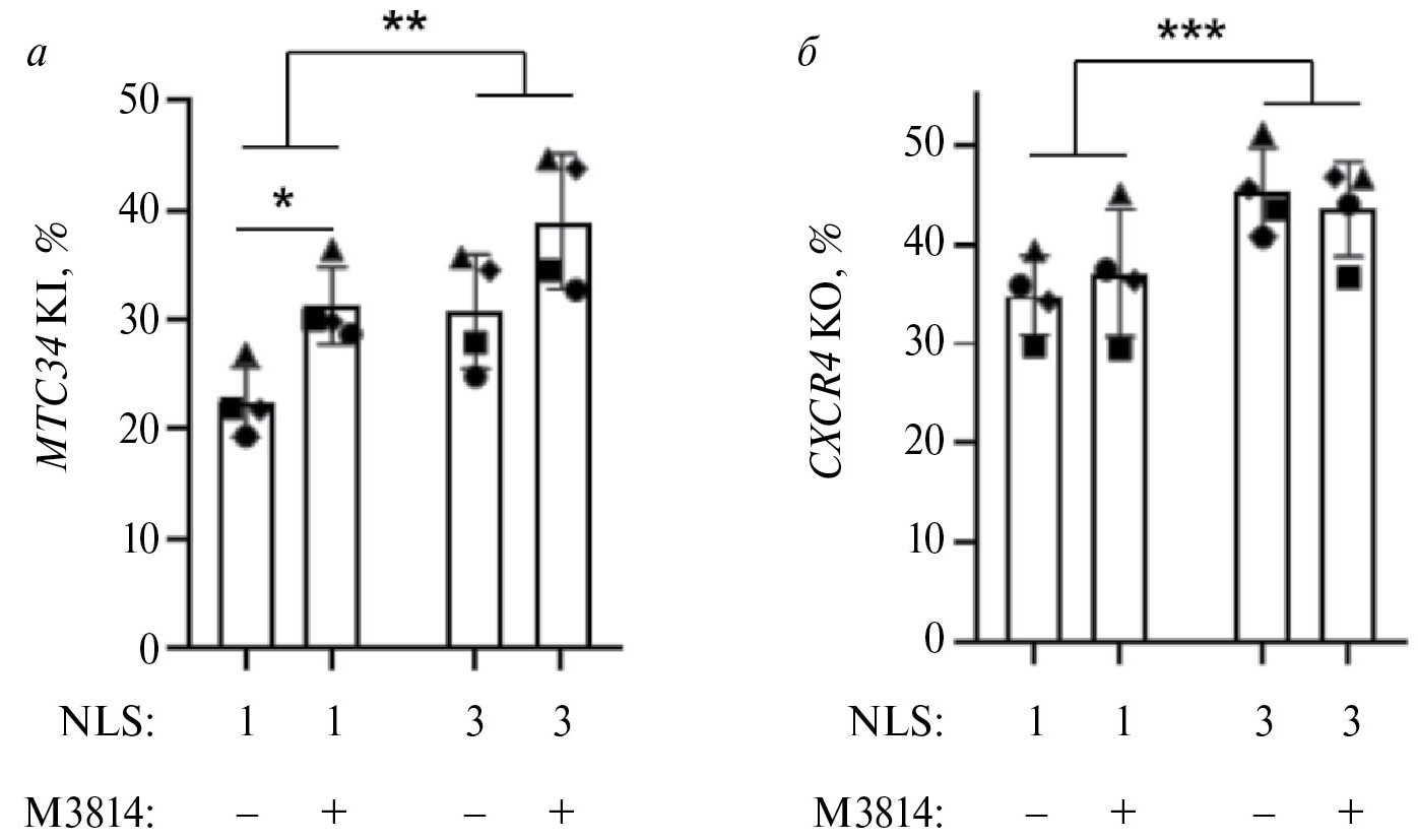 В результате проведенных экспериментов установлено, что использование Cas9-3×NLS и обработки клеток ингибиторами DNA-PK: Ku0060648 и M3814 – приводило к значимому повышению уровня нокина MTC34 в локус CXCR4. Далее оценили эффективность комбинирования этих подходов. Для этого клетки электропорировали смесью плазмид, кодирующих гРНК, донорную последовательность без модификаций и Cas9 с 1×NLS или 3×NLS.