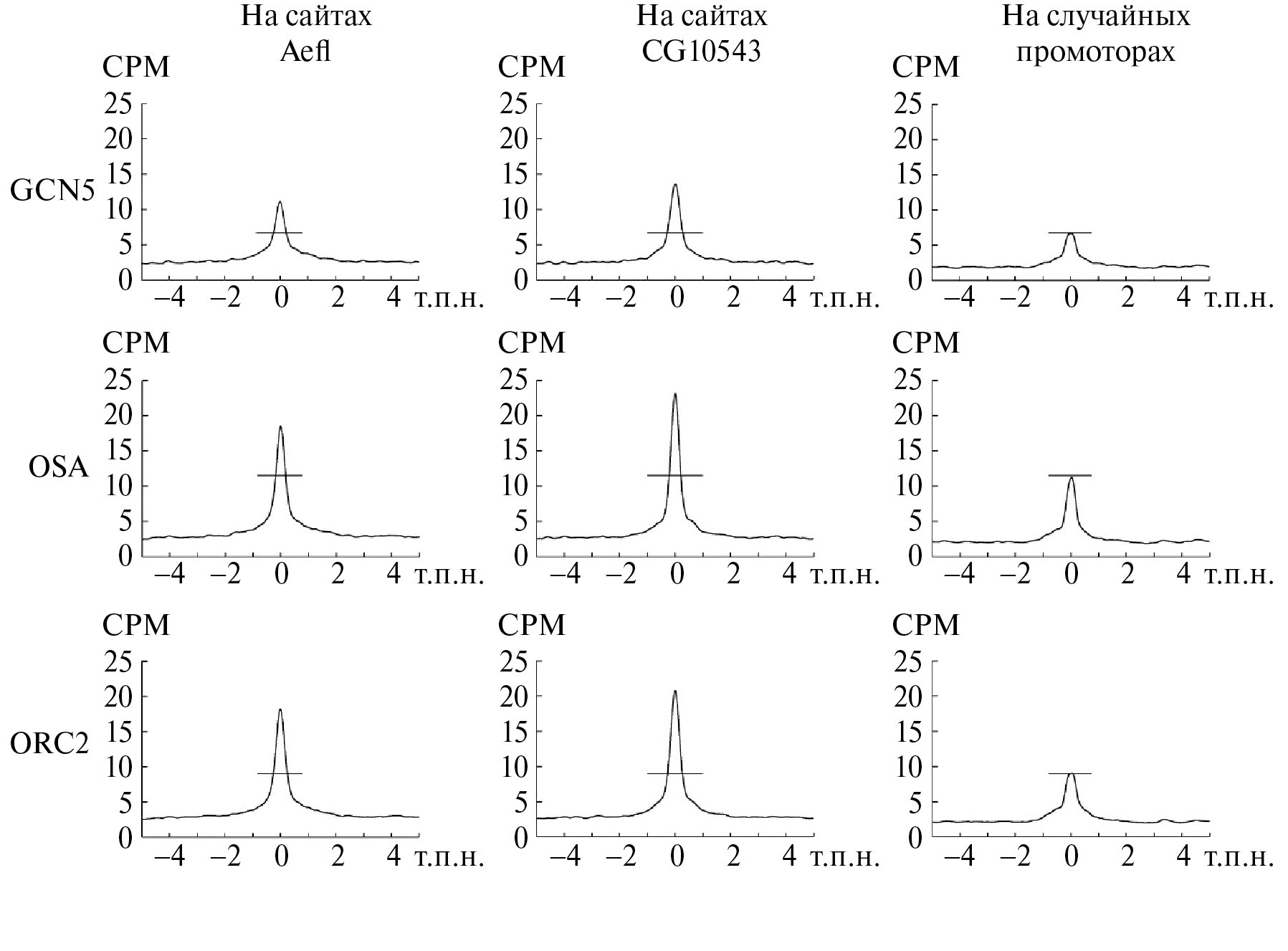Рис. 5. Усредненные ChIP-Seq-профили белков ORC2 (комплекс ORC), OSA (комплекс SWI/SNF) и GCN5 (комплекс SAGA) на сайтах связывания белков Aef1, CG10543 и на случайных промоторах. Слева указаны субъединицы данных комплексов: ORC2 (ORC), OSA (SWI/SNF), GCN5 (SAGA). Представлен средний ChIP-Seq-профиль белков (указаны слева) на трех группах сайтов (указаны вверху). По оси ординат профили представлены в единицах CPM, по оси абсцисс указано расстояние в т. п. н. относительно центра пика. В каждой из групп анализировали примерно по 3500 сайтов. Горизонтальными отрезками отмечен уровень сигнала на случайных промоторах. Видно, что субъединицы комплексов SAGA, SWI/SNF и ORC привлекаются на сайты Aef1 и CG10543 в большем количестве, чем на случайные промоторы.