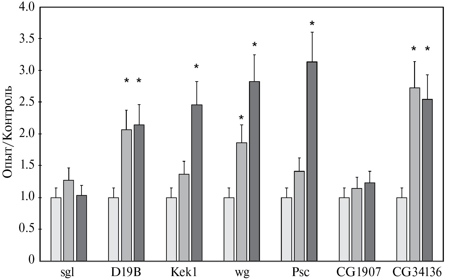 sgl – CGTGATAACTCTGGTGGACAAG и GTCTCGATGTCCGTTGAGAAG; D19B – TTGCCGAAAAGGCTTTACCAC и CACTCCGTGCAGGGGAAGTC; Kek1 – ACCCTGCTGCCTGGAATGAT и GCATGTAGCCATCCTCAGTCATC; wg – ACTGCTCGACGAGAAACTTCTC и TGTAGTCGCAGGTGCAGGAC; Psc – CGCTGACTCAAAACTCAAGTGTG и TCGATTCTGGCGTCATCATAGTA; CG1907 – CCGCTAGACTTGGTCAAGACC и TGTCTCAGCAGAGCAGCTCC; CG34136 – TGCCTTGCATTCTTCGCTTG и GTCGTGGCGCTGTAGGGACT; Ras64B – GAGGGATTCCTGCTCGTCTTCG и GTCGCACTTGTTACCCACCATC.