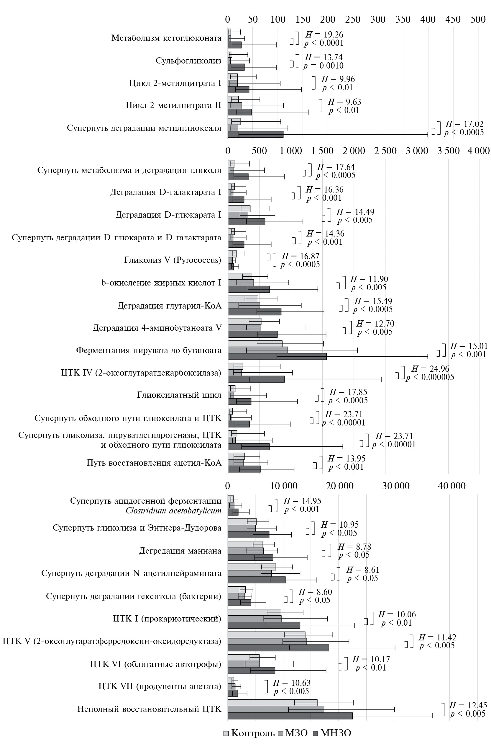 Энергетический обмен. И метаболически здоровый, и метаболически нездоровый фенотипы ожирения приводили к изменению в метаболических профилях распространенности путей, вовлеченных в энергетический обмен кишечной микробиоты (рис. 2). Большинство таких изменений регистрировали у пациентов с МНЗО, хотя снижение гликолиза V (Pyrococcus), характерного для архей, детектировали и у пациентов с МЗО.