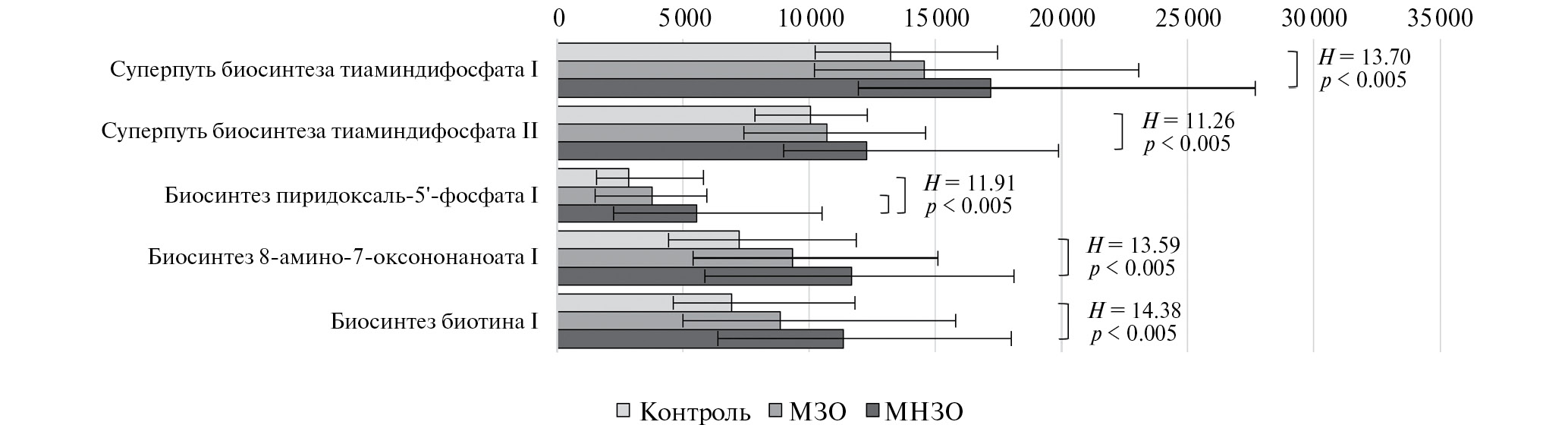 Рис. 3. Анализ путей синтеза водорастворимых витаминов в метаболических профилях микробиома пациентов с МЗО и МНЗО.
